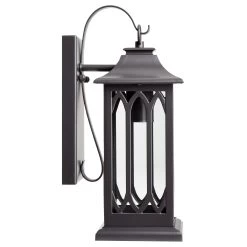 For a sophisticated statement fixture, look no further than the cathedral-inspired Stonehouse Outdoor Entrance Wall Sconce. Decorative vertical fretwork supports the lamp’s sloped roof, which shields its single bulb from outside elements. Made of durable aluminum, the Stonehouse will mount stylishly on an exterior wall.