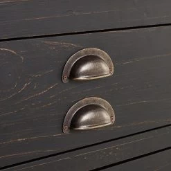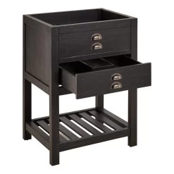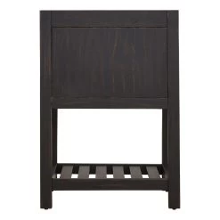 The 24″ Ansel Console Vanity for Rectangular Undermount Sink is designed to bring rustic charm to your small bathroom. Taking up minimal space in the room, this product offers two storage areas. The lower shelf features wood slats that provide a sound foundation for your towels and accessories. The U-shaped drawer has soft-close hinges to deliver smooth functionality. Made of pine, this sturdy cabinet has a textured feel and a rustic black finish that give it a reclaimed look.