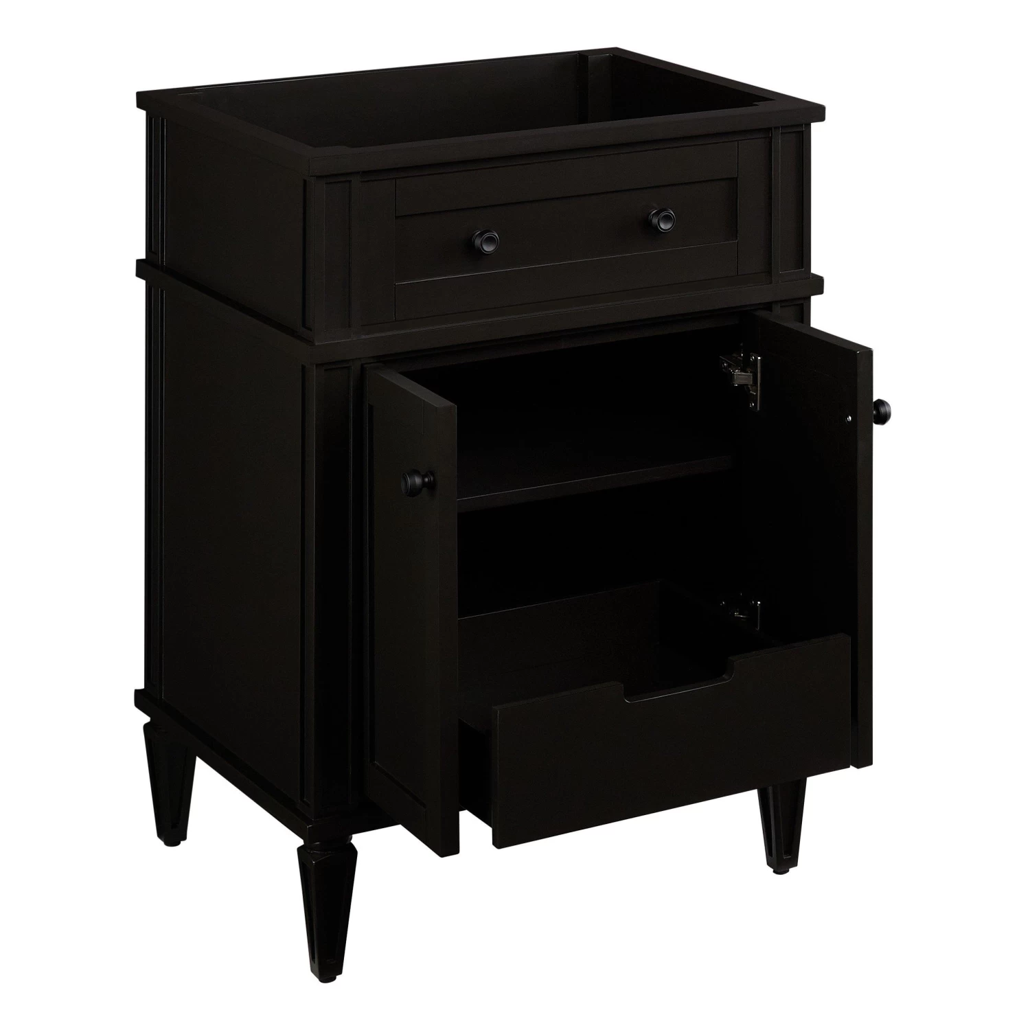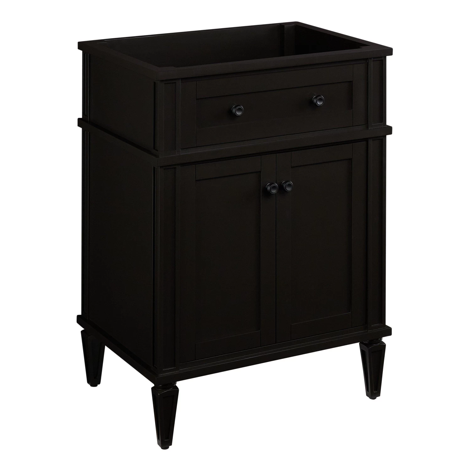 Elevate your compact bathroom or powder room with the 24″ Elmdale Vanity in charcoal black. Its timeless design and finish are combined with elegant touches, making it the perfect choice for both traditional and transitional spaces. A set of doors is complete with an adjustable shelf and soft-closing hinges for optimal use and a quality feel. Top off the look with the matching vanity mirror.