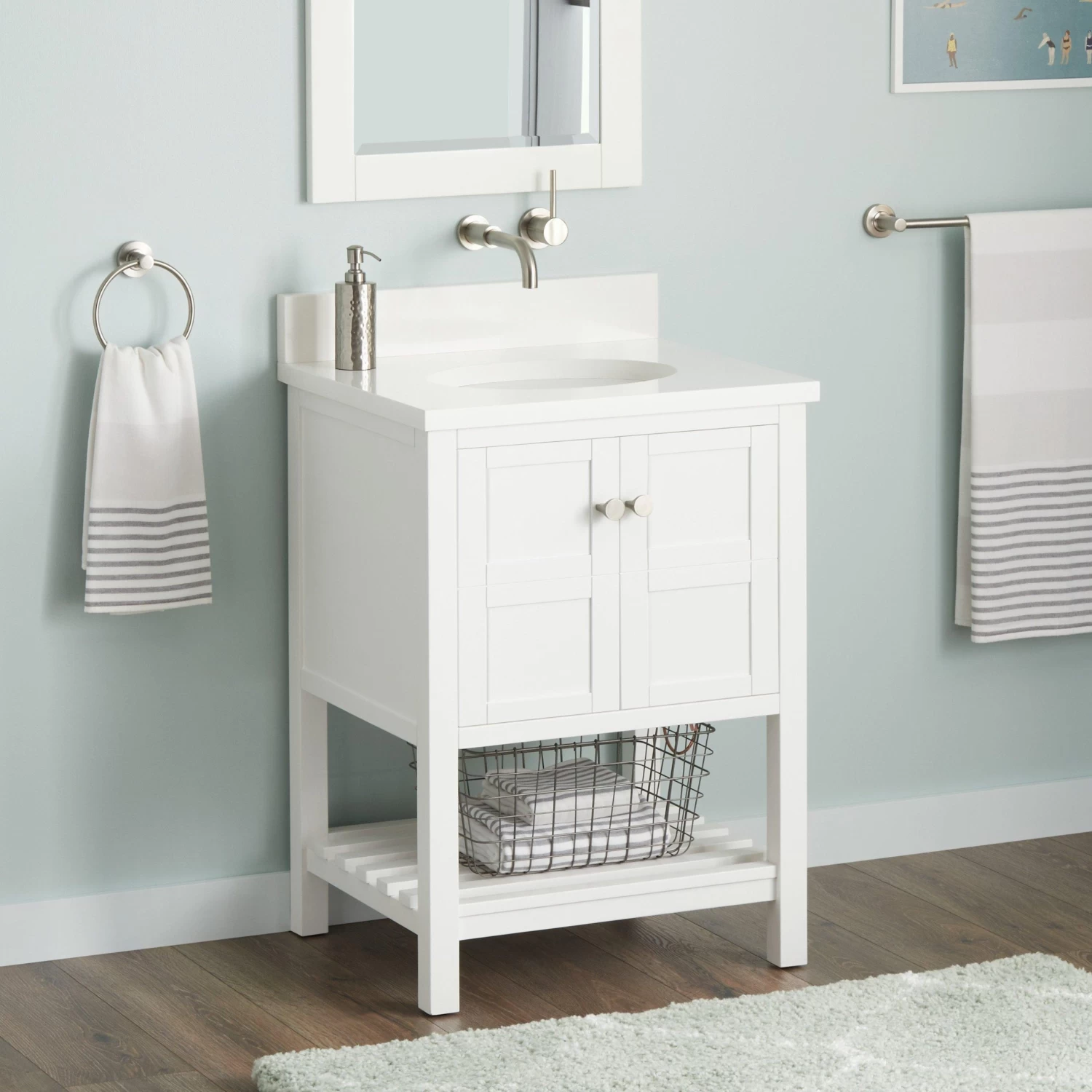 Transform the look of your space by adding the 24″ Olsen Console Vanity for Undermount Sink in a beautiful soft white finish. Constructed to last a lifetime, this vanity has a durable wood build. A pair of subtly detailed doors are equipped with soft-close hinges that operate quietly and prevent slamming. An abundance of storage space is provided within the cabinet for everyday necessities, with an open shelf to keep your folded towels below.