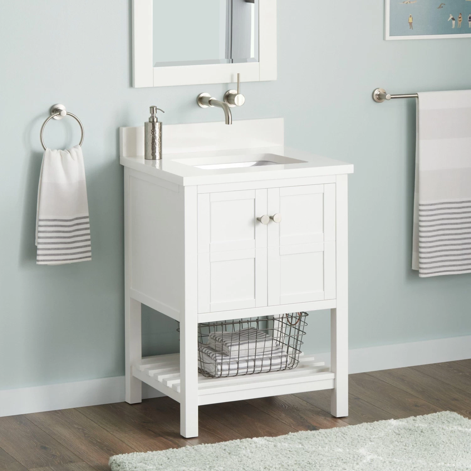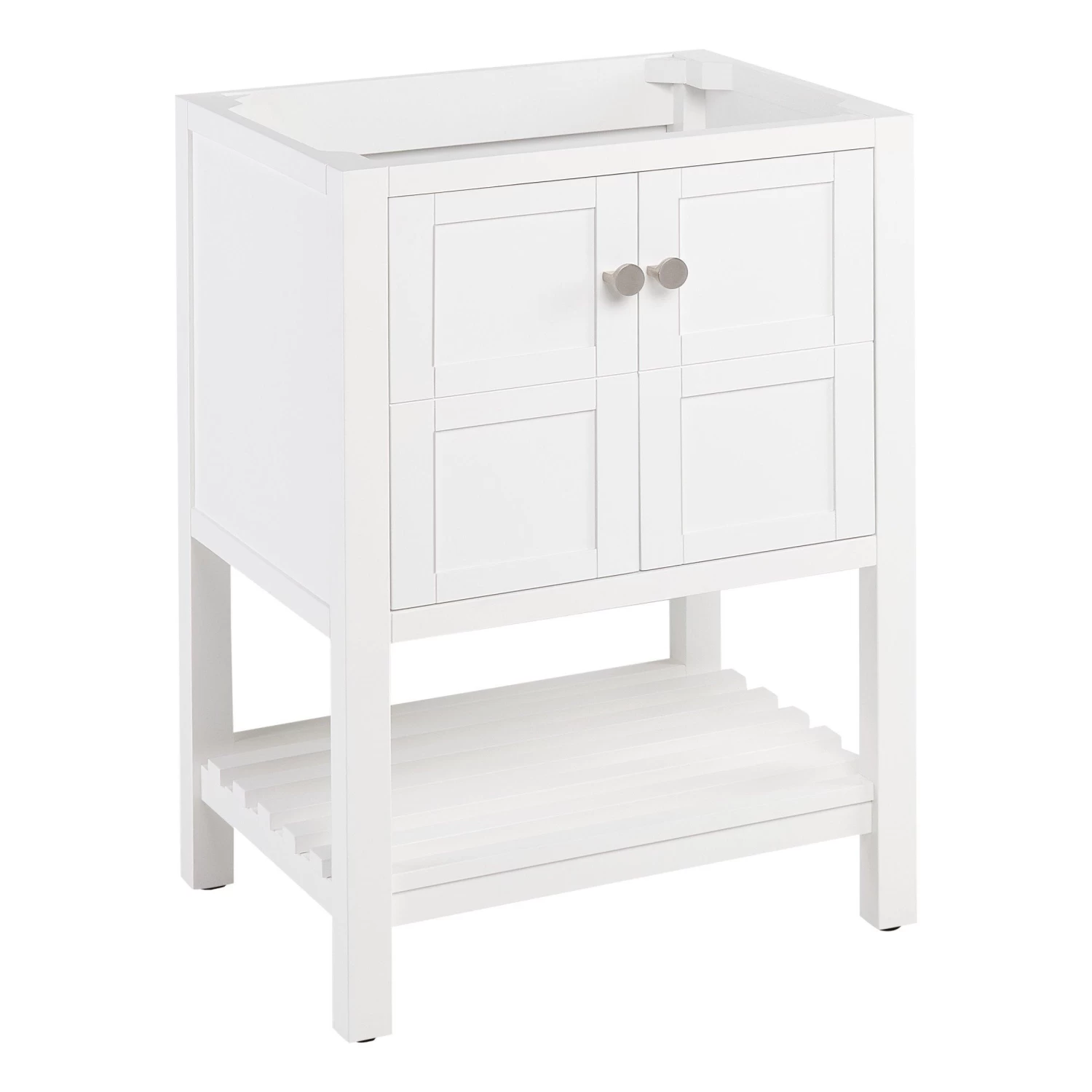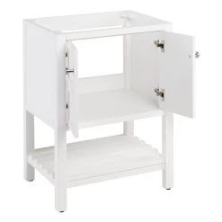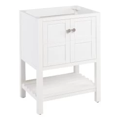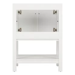 A soft white finish makes the 24″ Olsen Console Vanity for Rectangular Undermount Sink perfect for your bathroom update. Crafted from wood, this cabinet has a premium build to complement its looks. Its simple design includes square detailing on each of its doors and a slatted, open shelf for storing towels and washcloths. Other toiletries can be kept within the Olsen’s spacious interior. Soft-close hinges and brass knobs complete this vanity’s superior offering.