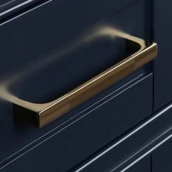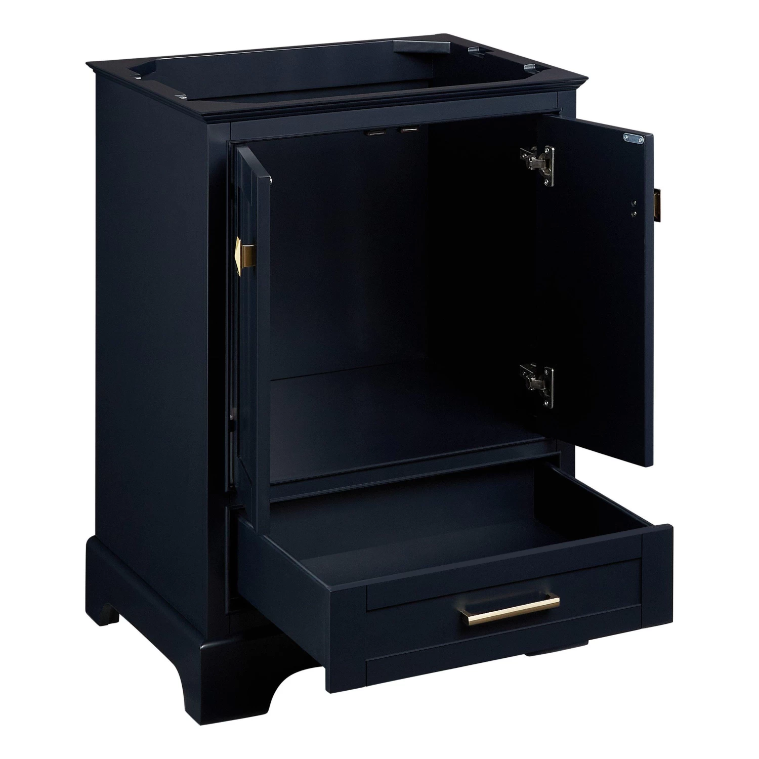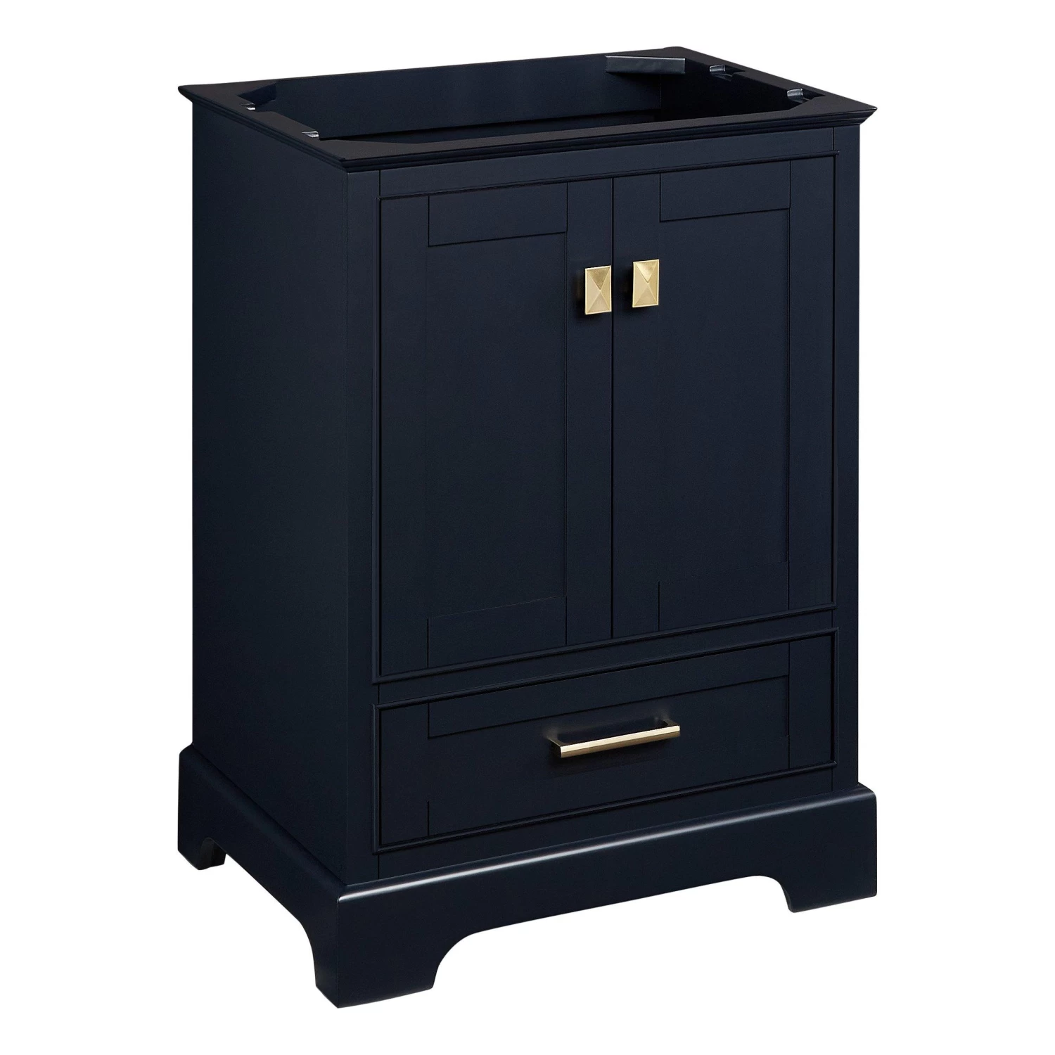 Maximize space and style in your bathroom with the 24″ Quen Vanity. Featured in a midnight navy blue finish with satin brass hardware, this piece brings sophistication to any space. For keeping items out of sight, plenty of storage is offered with a cabinet and a bottom drawer. All entry points are outfitted with soft-close hinges and slides to ensure use is smooth and quiet. Add on the matching vanity mirror for the ultimate cohesive look.