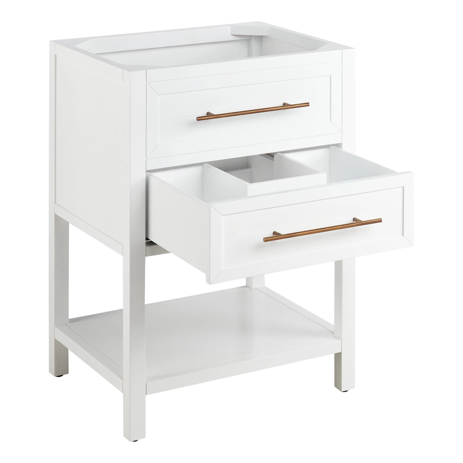 The 24″ Robertson Vanity features an exposed shelf and U-shaped drawer. Designed for a rectangular undermount sink, this bright white cabinet is a great choice for your bathroom remodel.