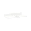 This 25″ quartz vanity top features light, feathery gray veining that stands out on its bright white background. It comes pre-drilled for your choice of faucet and includes a matching backsplash. At 3cm thick, it’s meant to handle the demands of everyday use. Pre-cut for an oval undermount sink.