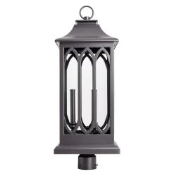 For a sophisticated statement fixture, look no further than the cathedral-inspired Stonehouse 3-Light Outdoor Post Lantern. Decorative vertical fretwork supports the lamp’s sloped roof, which shields its cluster of candelabra bulbs from outside elements. Made of durable aluminum, the Stonehouse will mount stylishly on a new or existing post.