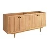 The 30″ Bastian Teak Vanity is perfect for small spaces. Its simple aesthetic makes the Bastian a great fit for a variety of styles. Shades of gold and medium brown swirl throughout the wood grain, giving the cabinet understated flair.
