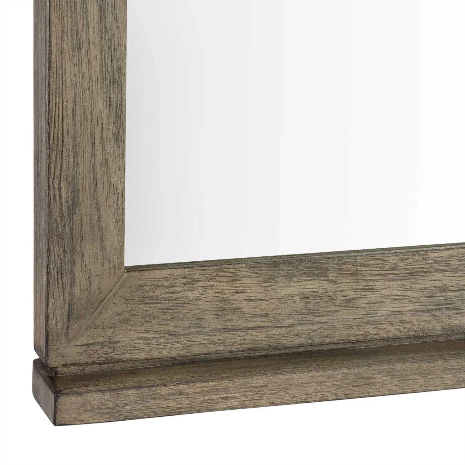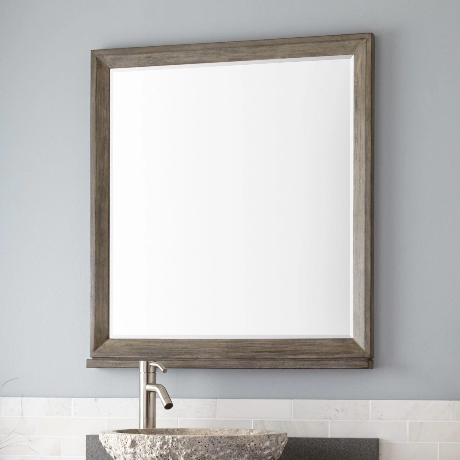 A wood frame surrounds the glass on the 30″ Davyn Mirror. This product features a gray wash finish that coordinates with a similarly designed vanity.