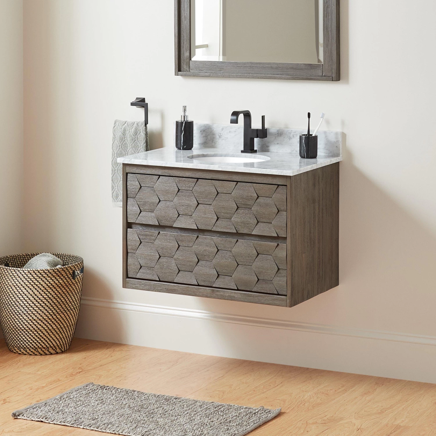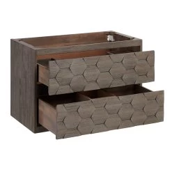 Give your bathroom a stylish update while saving precious space with the 30″ Devora Wall-Mount Vanity with Undermount Sink. Finished in a sophisticated port gray, its wood build is highlighted with a striking hexagon surface pattern, giving this piece a modern yet rustic quality. Featuring two hidden dovetail drawers with soft-close slides, this vanity achieves a seamless look while providing optimal usability. Wall-mount construction creates a floating effect that not only clears up floor space but gives additional room for baskets or other storage opportunities. With mounting hardware included, the Devora is ready to create a statement in bathrooms of all sizes. For a cohesive look, add the matching vanity mirror.