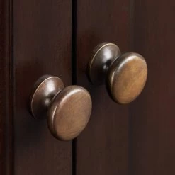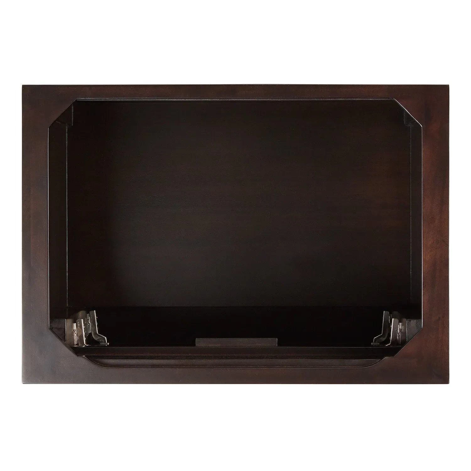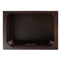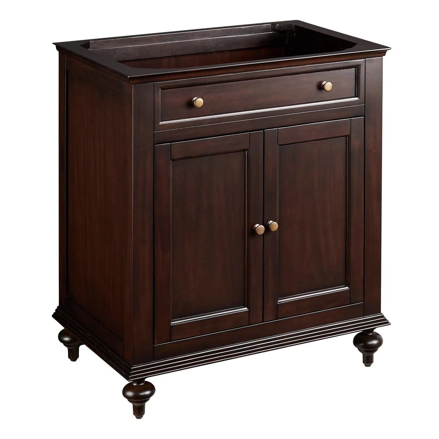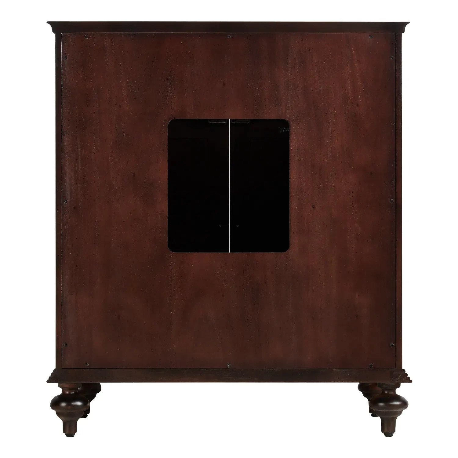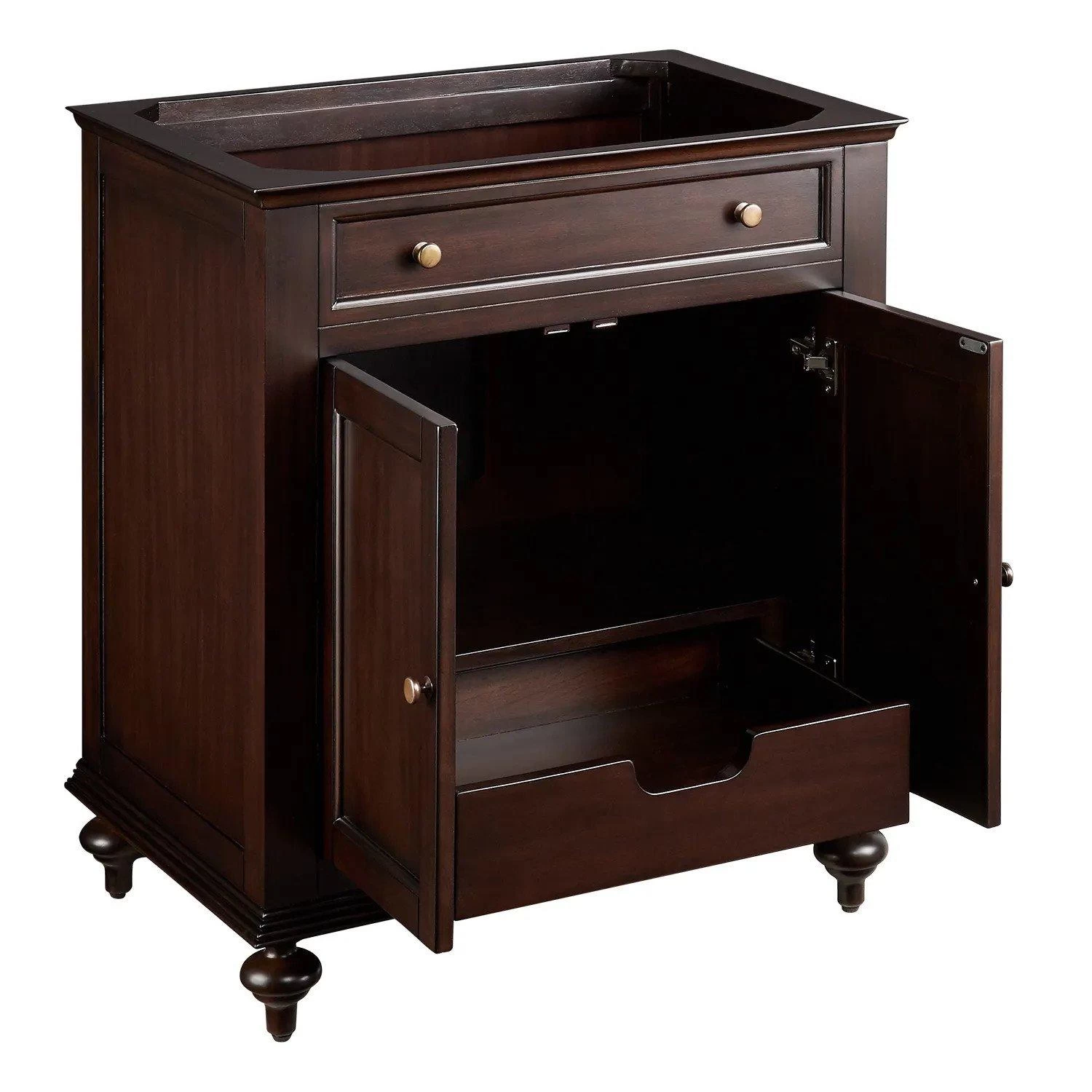 The 30″ Keller Mahogany Vanity features antique brass knobs, round bun feet, and a dark espresso finish. Perfect for a petite bathroom, this cabinet stylishly holds your toiletries. Additional premium features include decorative trim and soft-close hinges.