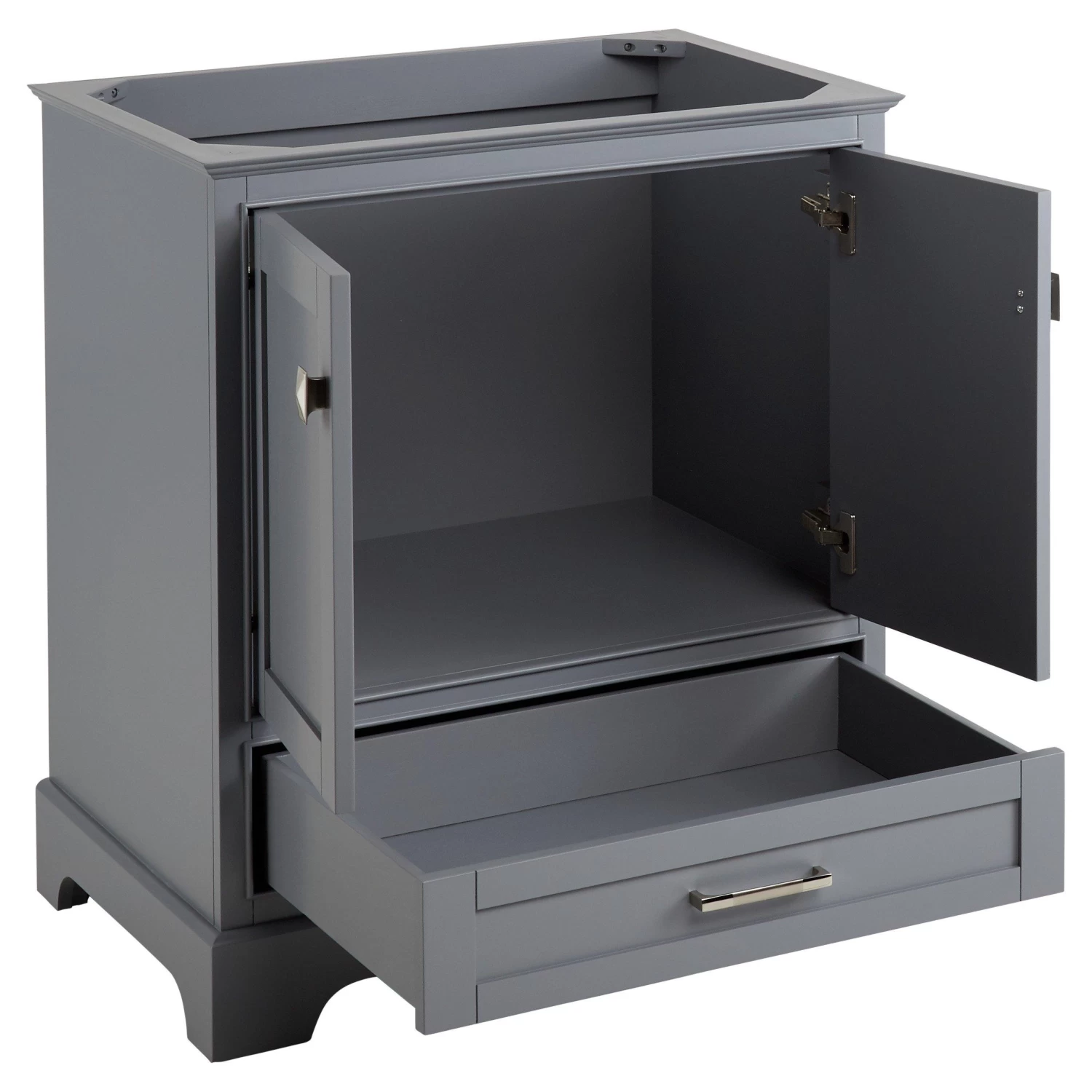 The gorgeous gray finish of the 30″ Quen Vanity will instantly refresh your space. Brushed nickel hardware adorns the spacious double doors and bottom drawer. For added luxury, all entry points boast soft-closing hardware. Traditional and modern bathrooms alike can enjoy generous storage without sacrificing quality or style with its versatile transitional design. To polish off the look, add the matching vanity mirror.