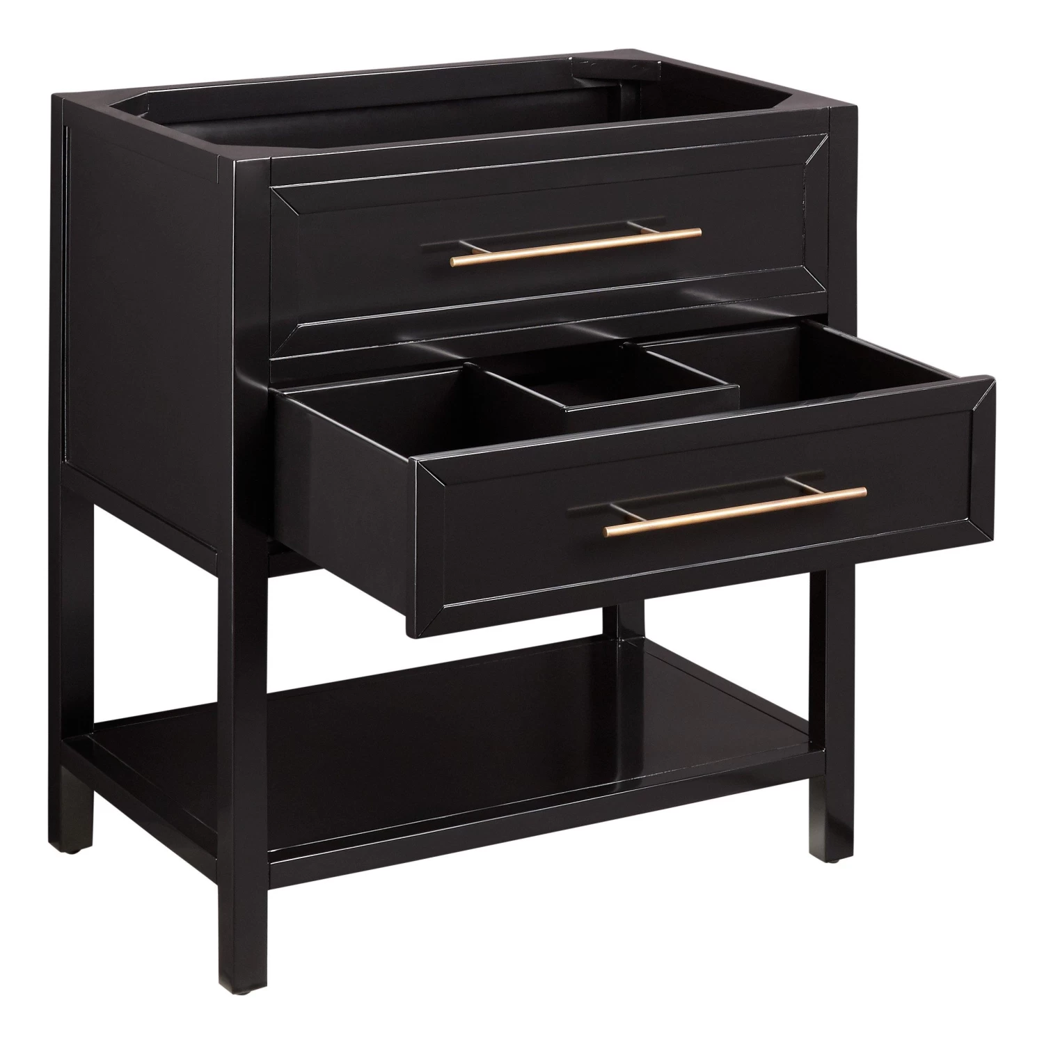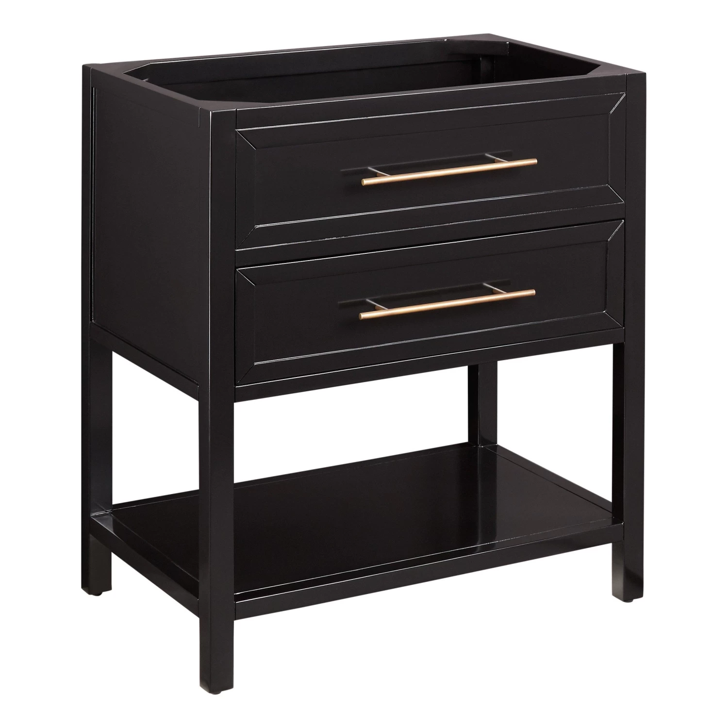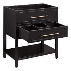 Complete your bathroom with a touch of sophistication and timeless style courtesy of the 30″ Robertson Console Vanity for Rectangular Undermount Sink in black. Constructed of mahogany wood, this handsome piece features complementary Antique Brass hardware and a single soft-closing drawer. Underneath, you’ll find a spacious open storage area perfect for keeping your bathroom essentials within easy reach. Select a countertop to bring your vanity design goals to life.