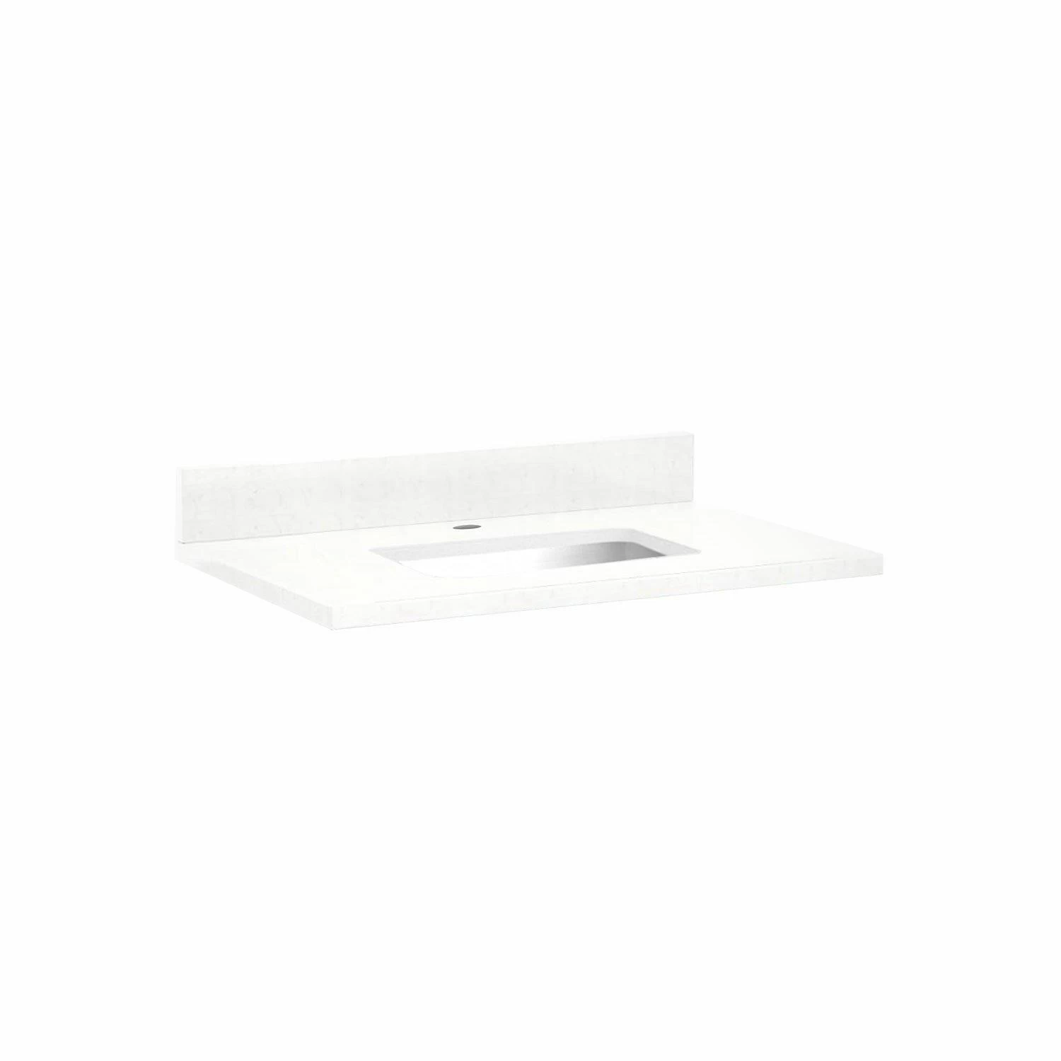 This 31″ quartz vanity top features light, feathery gray veining that stands out on its bright white background. It comes pre-drilled for your choice of faucet and includes a matching backsplash. At 3cm thick, it’s meant to handle the demands of everyday use. Pre-cut for a rectangular undermount sink.