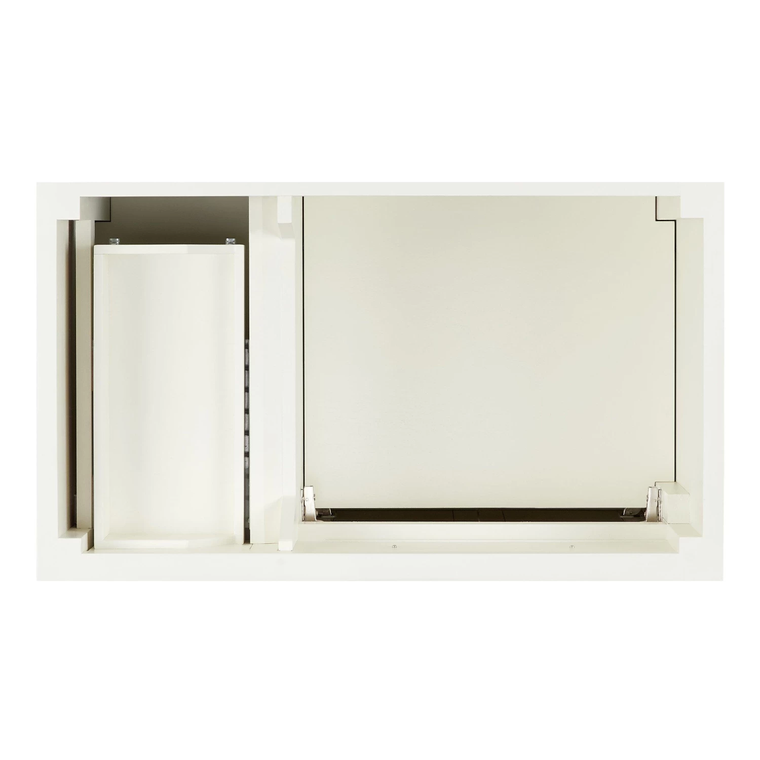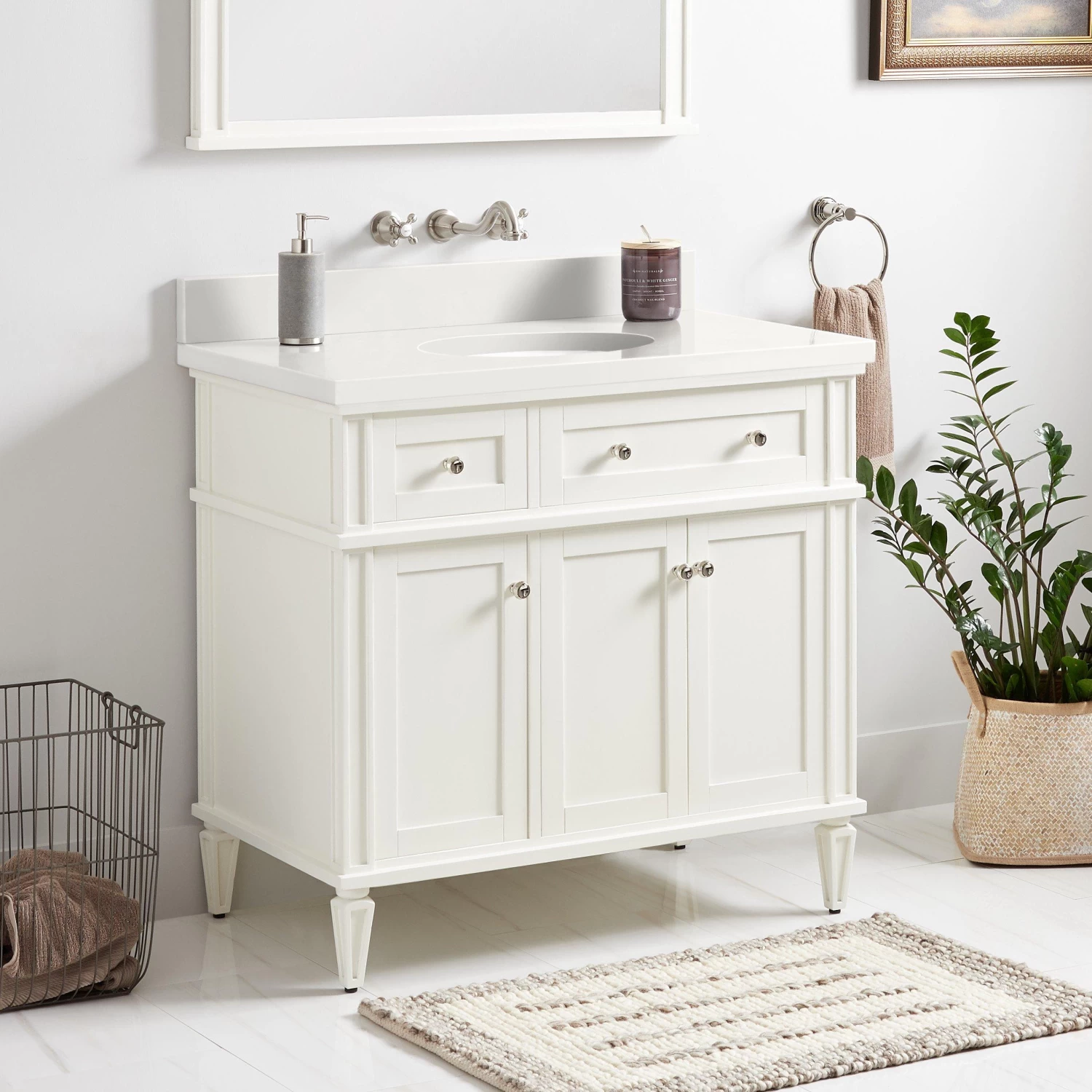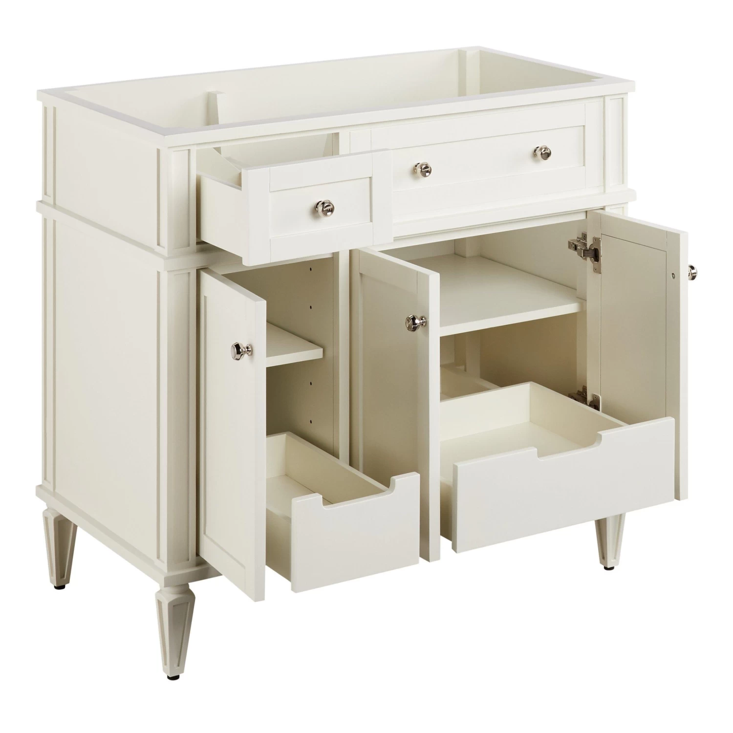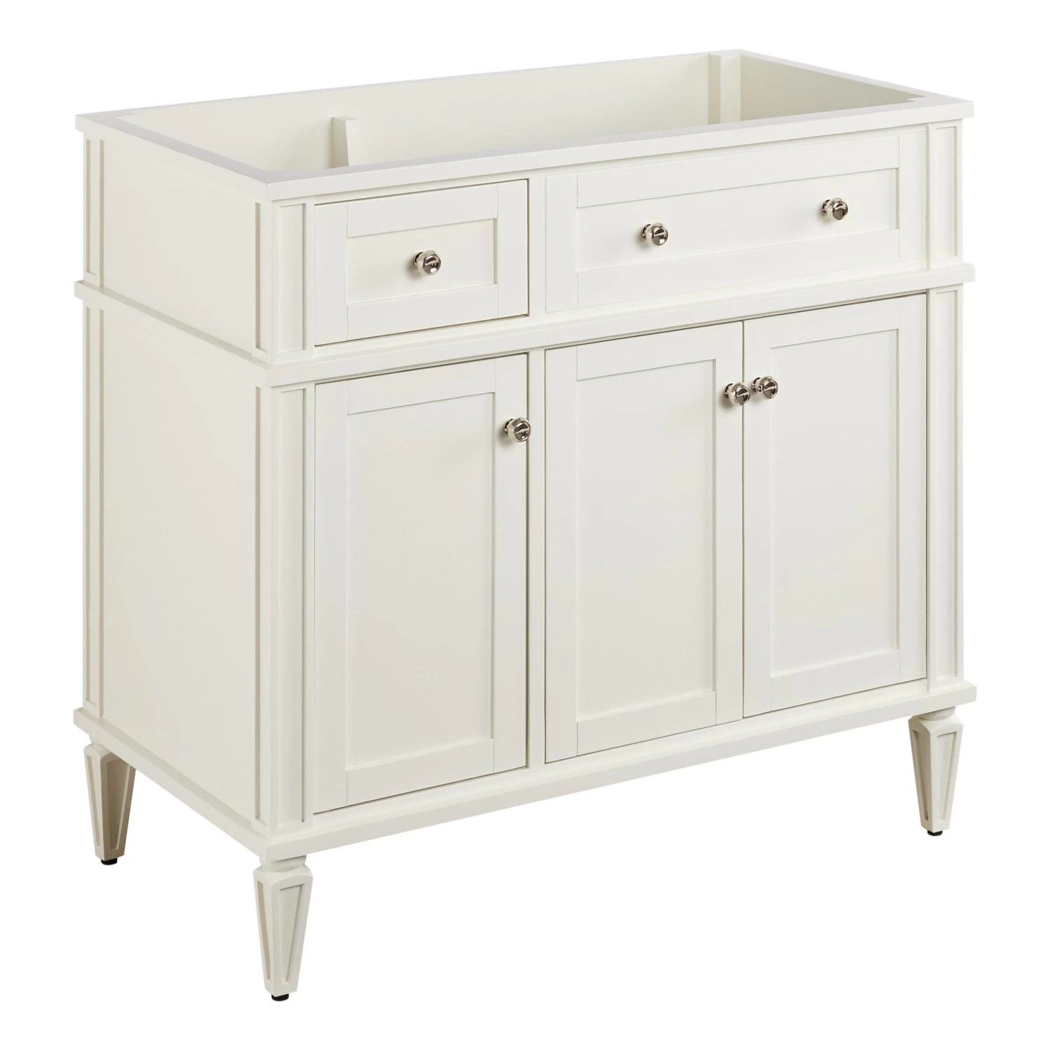 Enjoy plentiful storage with the 36″ Elmdale Vanity. Featuring two separate lower compartments, each with a customizable shelf and soft-pull drawer, this vanity is excellent for shared use. Constructed from solid mahogany and finished in a crisp white that immediately brightens your bath, the Elmdale is perfect for traditional or transitional spaces.