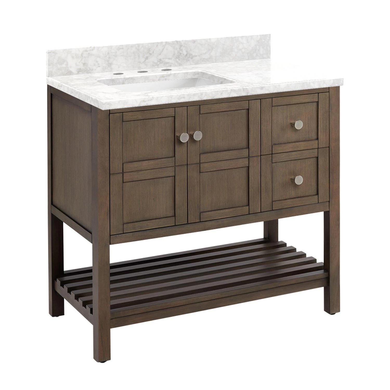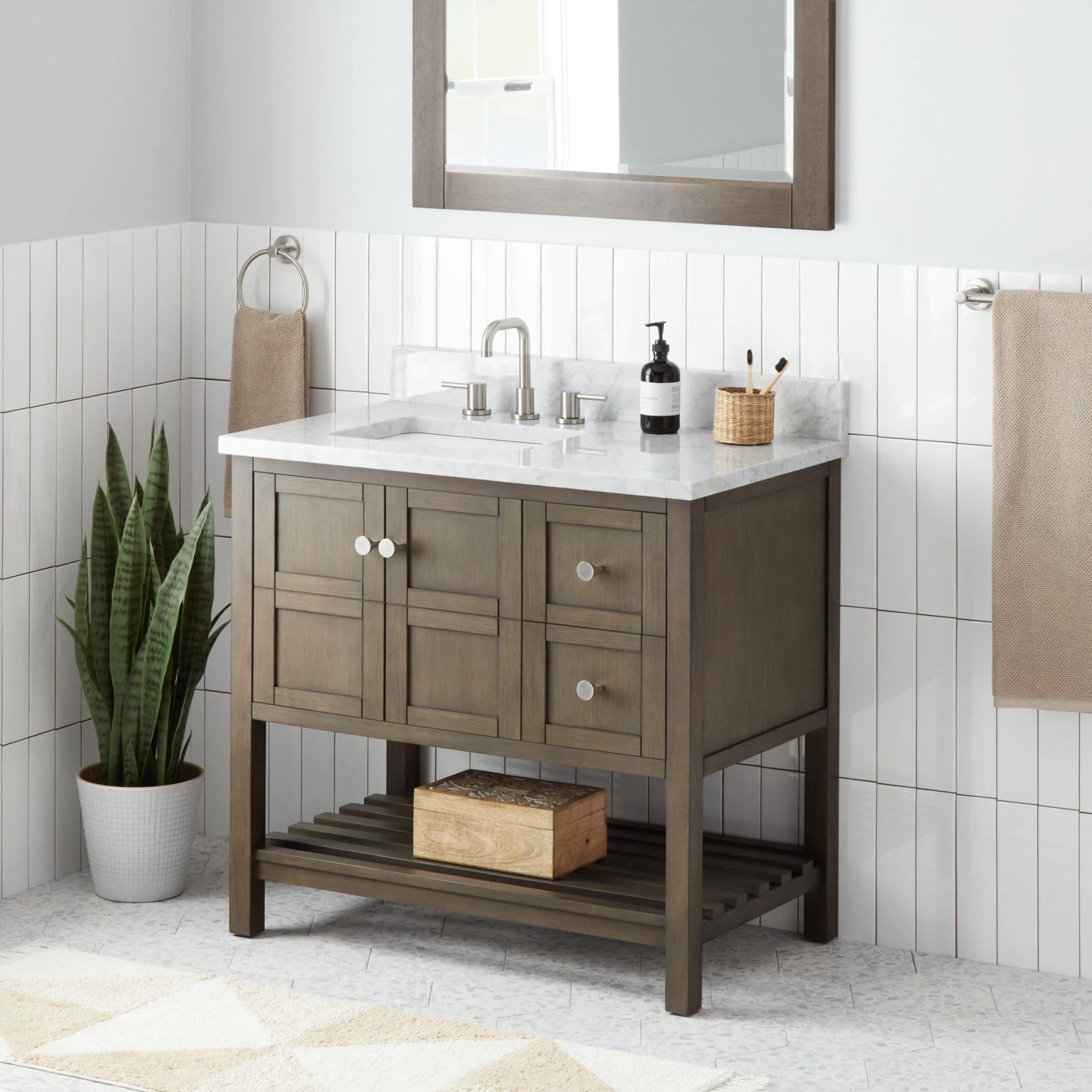 The 36″ Olsen Console Vanity for Undermount Sink will captivate your guests with its unique, ash brown finish. Built to last, this vanity is made of wood and boasts premium features. Recessed panels line the front of this cabinet, which is embellished with brushed nickel brass knobs. The Vanity’s open concept features soft-closing doors and drawers as well as a slatted lower shelf to keep your essentials organized.