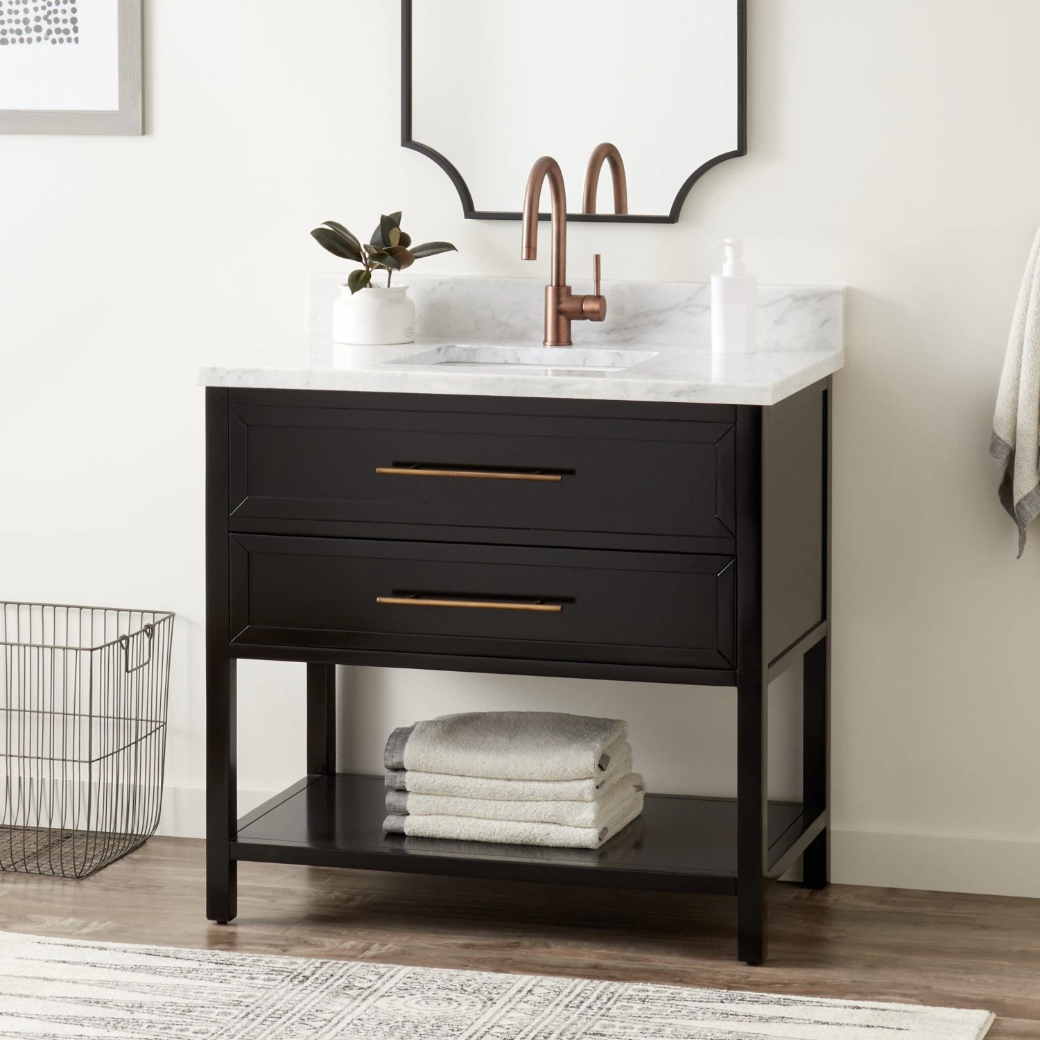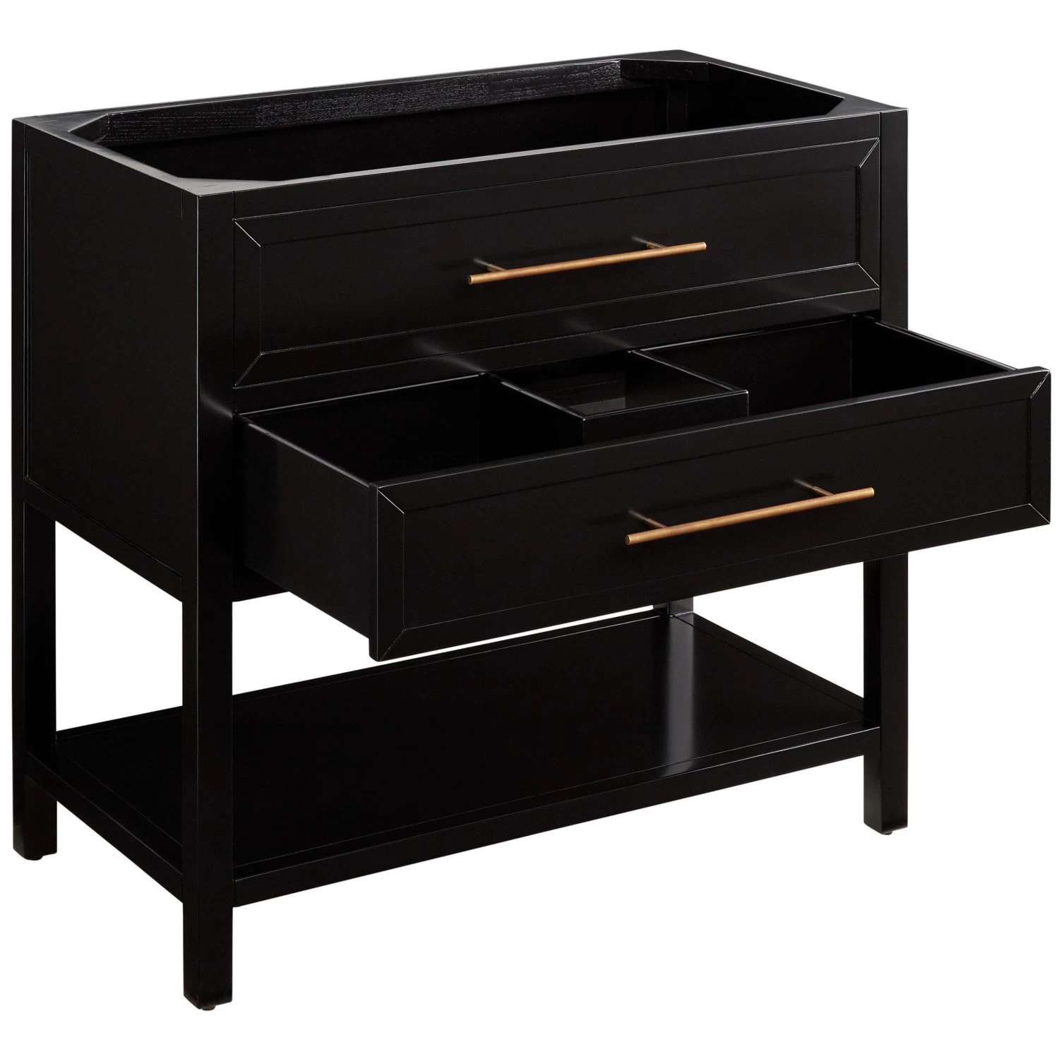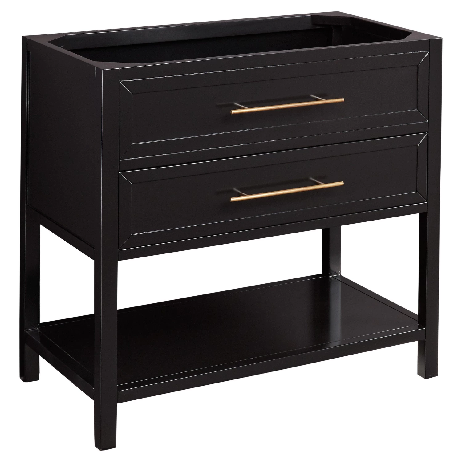 Refresh the look of your bathroom with the black 36″ Robertson Console Vanity. The simple design of this product includes a lower shelf and U-shaped drawer. Crafted for a rectangular undermount sink, the Robertson adds functional style to your space.