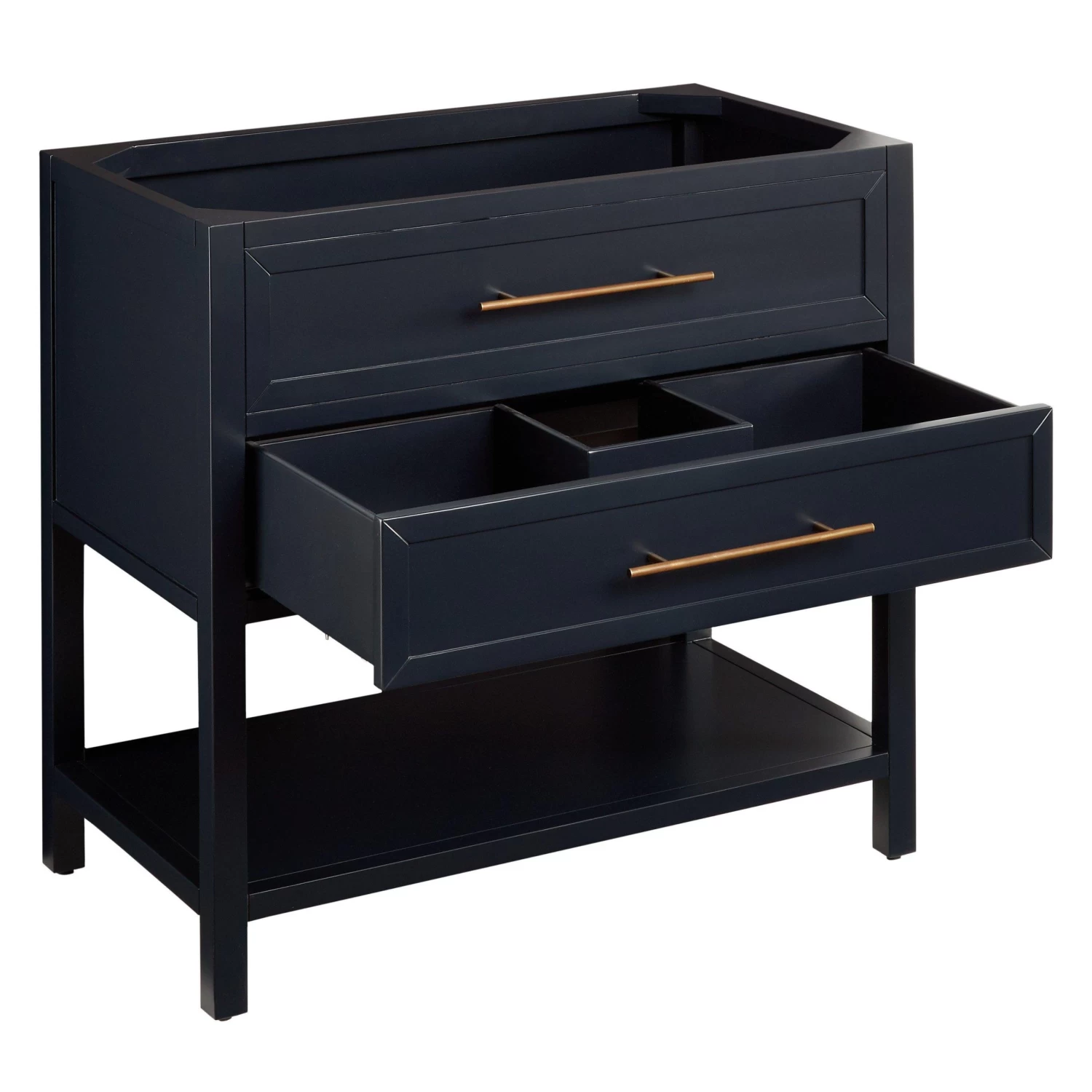 A sleek yet practical design makes the 36″ Robertson Console Vanity a great option for your bathroom update. The minimalist layout utilizes a drawer and a lower shelf to keep things simple and useful for a variety of storage needs. Finished in Midnight Navy Blue and embellished with pulls covered in satin brass, the Robertson is a stylish selection for your next update.