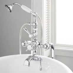 Enjoy a luxurious bathing experience with this Freestanding Thermostatic Tub Faucet and Supplies kit. Features Lever Handle diverters and a Cross Handle control for temperature and pressure balance.