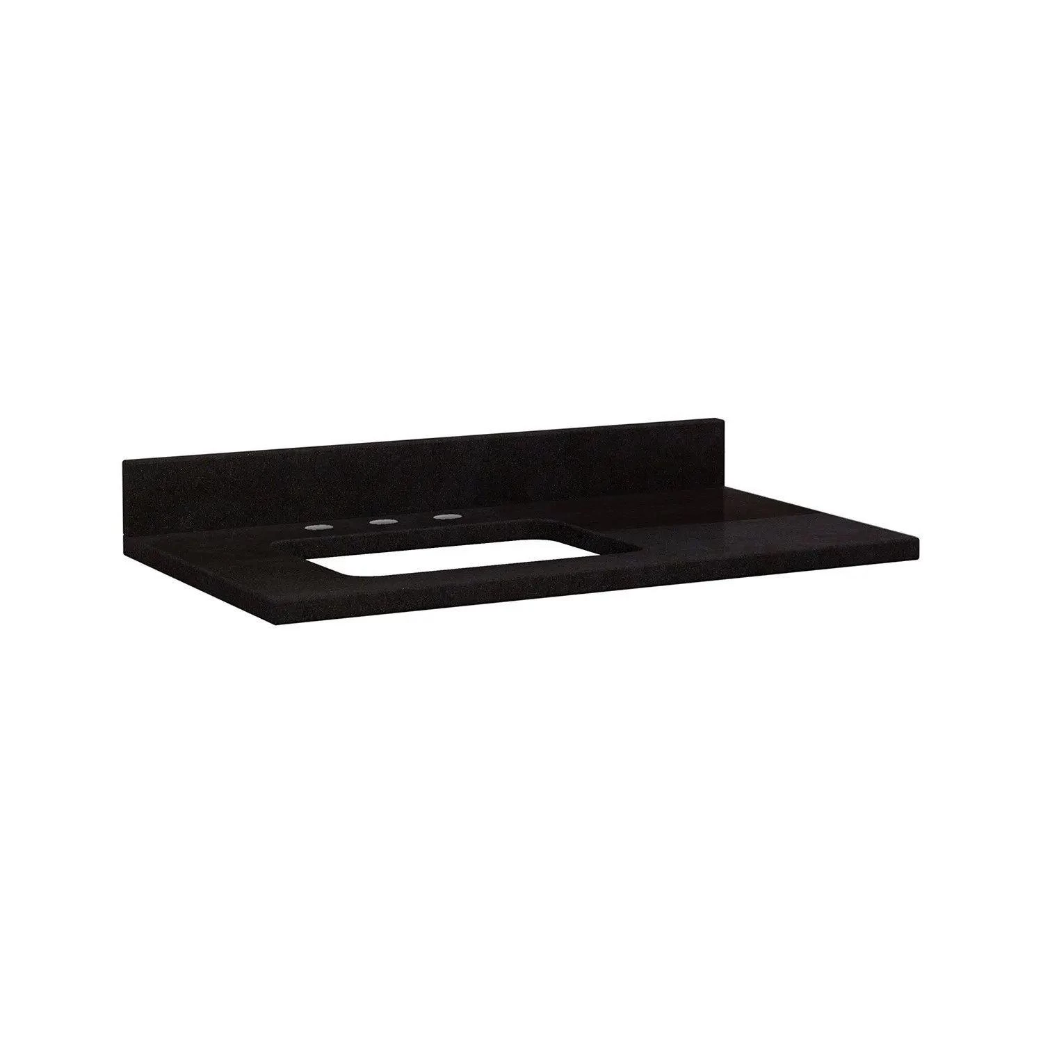 This granite vanity countertop features a beautiful, absolute black color that will complement any bathroom decor. Pre-cut for a rectangular undermount sink, it has an offset configuration that leaves plenty of counterspace to keep your everyday items. A matching backsplash is included, and an optional sidesplash is sold separately.