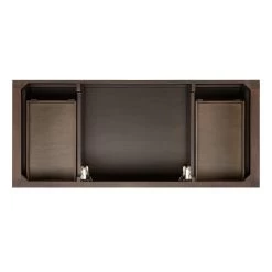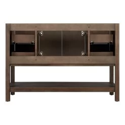 Featuring a beautiful ash brown finish, the 48″ Olsen Console Vanity will stand out in your bathroom. Built to last a lifetime, this cabinet is made of wood and contains soft-close hardware at every entry point. A pair of doors conceal an open middle storage area, with a stacked pair of drawers on either side. More space exists on the slatted shelf below, perfect to keeping linens easily accessible.