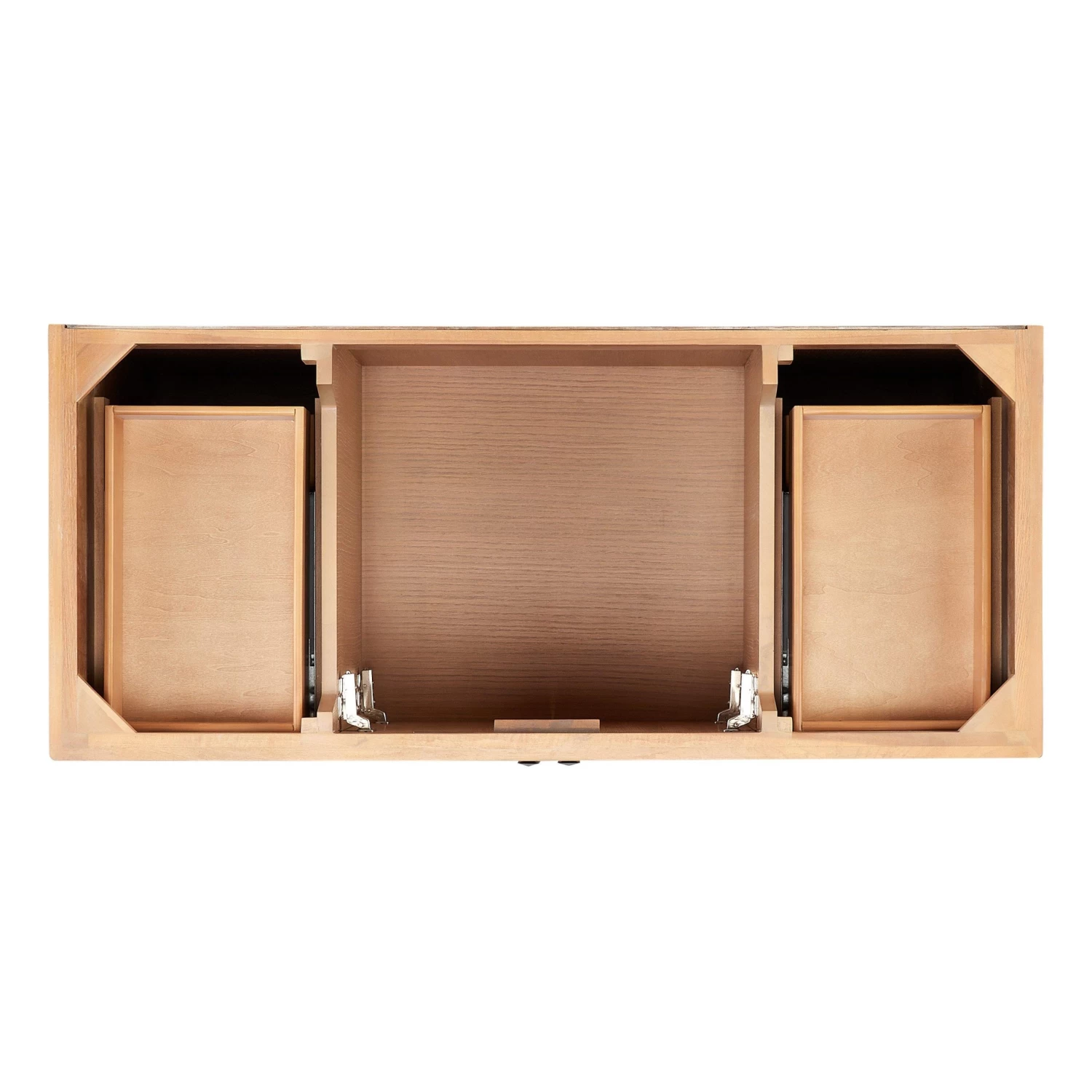 Give your space a stylish yet functional update with the 48″ Quen Vanity. A rustic driftwood brown finish complements the wood build while accenting satin black hardware to complete a stunning transitional look. The cabinet houses a compartment with nine surrounding drawers, ensuring every item has its place and can be easily accessed. For added luxury and seamless operation, all entry points include soft-close hinges and slides. To get the full effect, add on the matching vanity mirror.