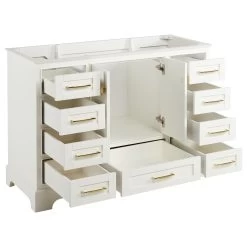 Give your bathroom a bright update with the 48″ Quen Vanity. Available in a crisp, soft white finish, this centerpiece is adorned with satin brass hardware that complements both modern and traditional spaces. With nine drawers and a roomy center cabinet, the Quen provides an abundance of storage options for all of your essentials. Every entry point is equipped with soft-close hinges or slides for smooth and quiet use.