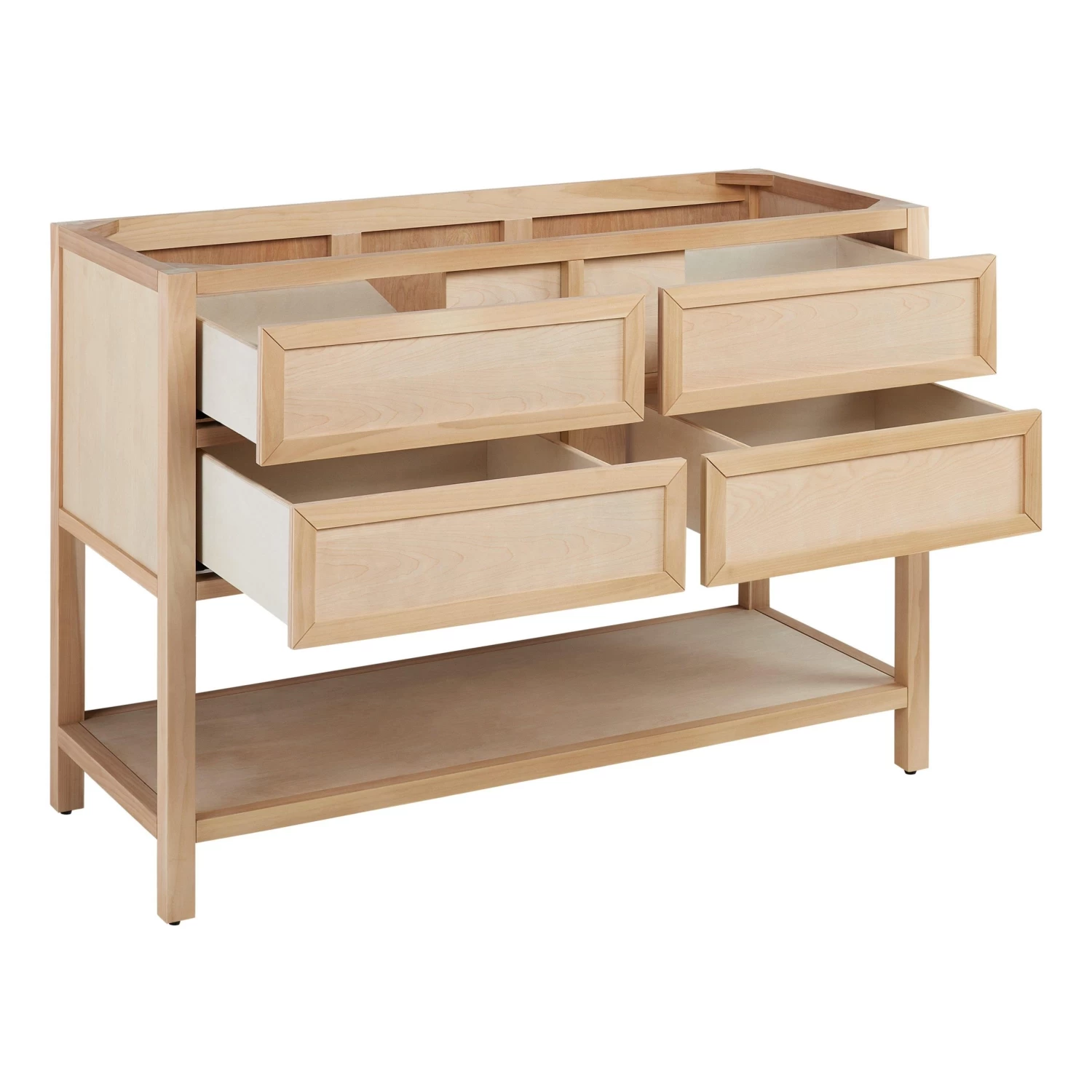 Bring out your inner interior designer with the 48″ Robertson Console Vanity with Undermount Sink. One of our top vanity builds, this unfinished centerpiece allows you to paint, stain, or adorn it to your liking. While you can customize this vanity however you wish, this version of the Robertson does not cut corners in quality. Enjoy four protective, soft-closing entry points and dovetail drawers that will withstand years of everyday use. Additionally, a lower shelf gives you easy access to bathroom essentials. Choose your favorite drawer pulls to complete the look.