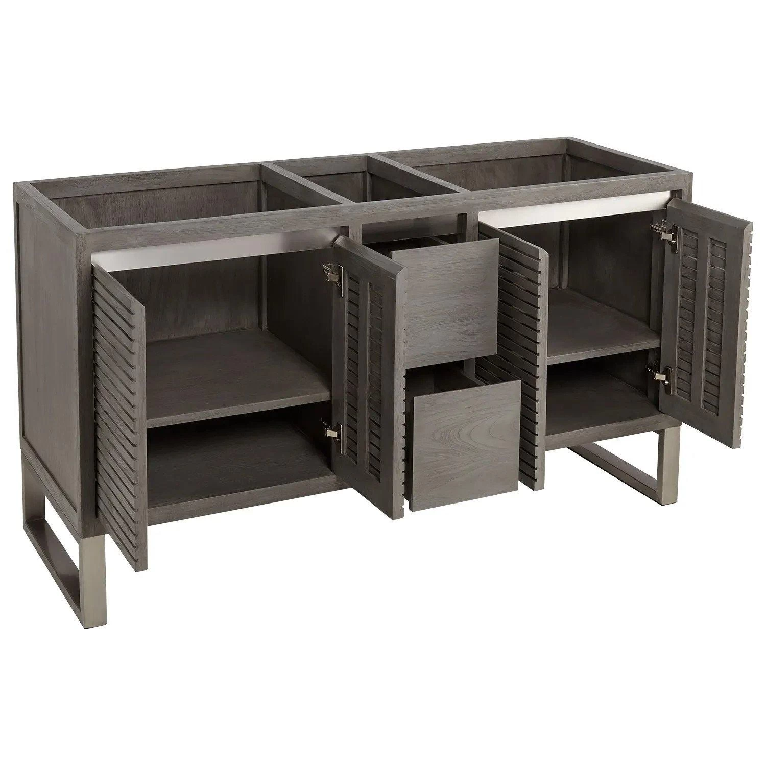 The 60″ Dickson Teak Double Vanity is a stylish and durable addition to your master bath. Ample storage space ensures that you have plenty of room to organize accessories. The Dickson features a mix of wood and metal to bring a modern look to your bathroom.