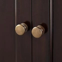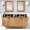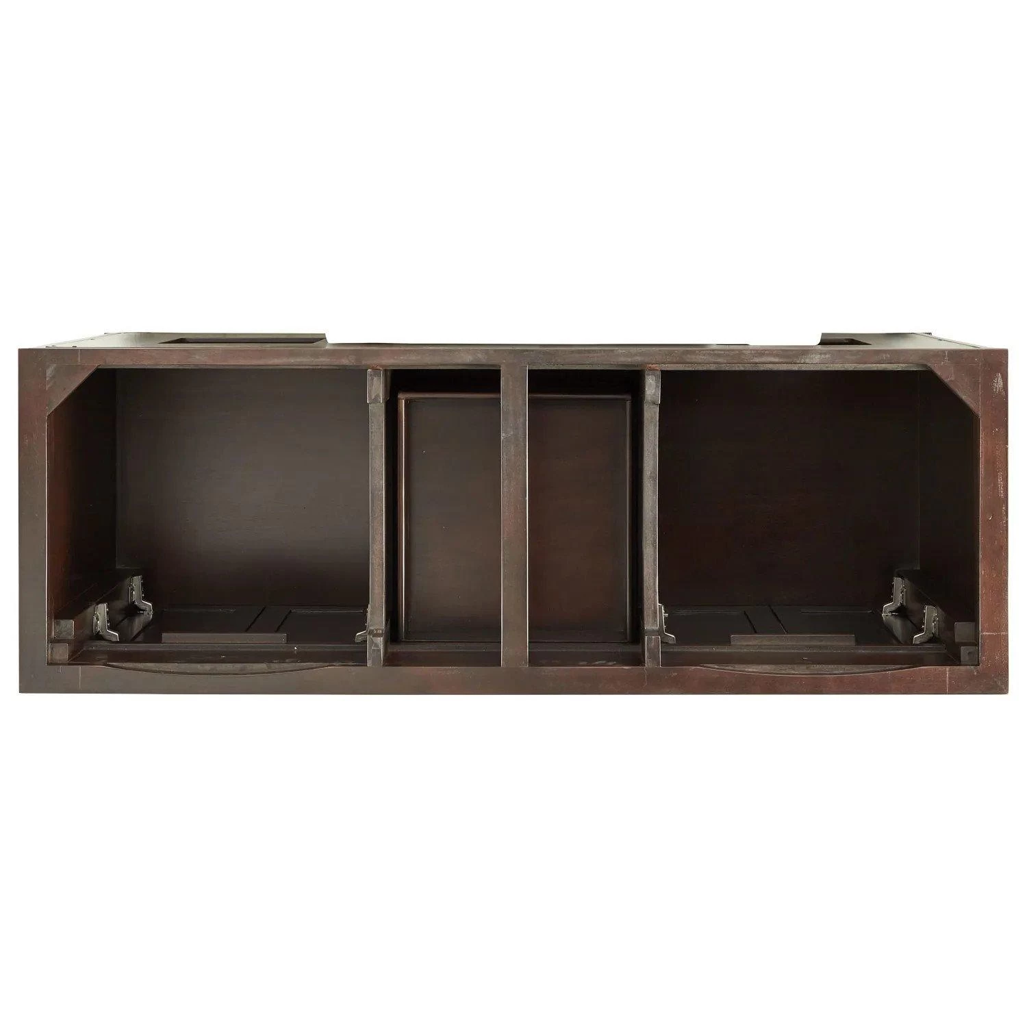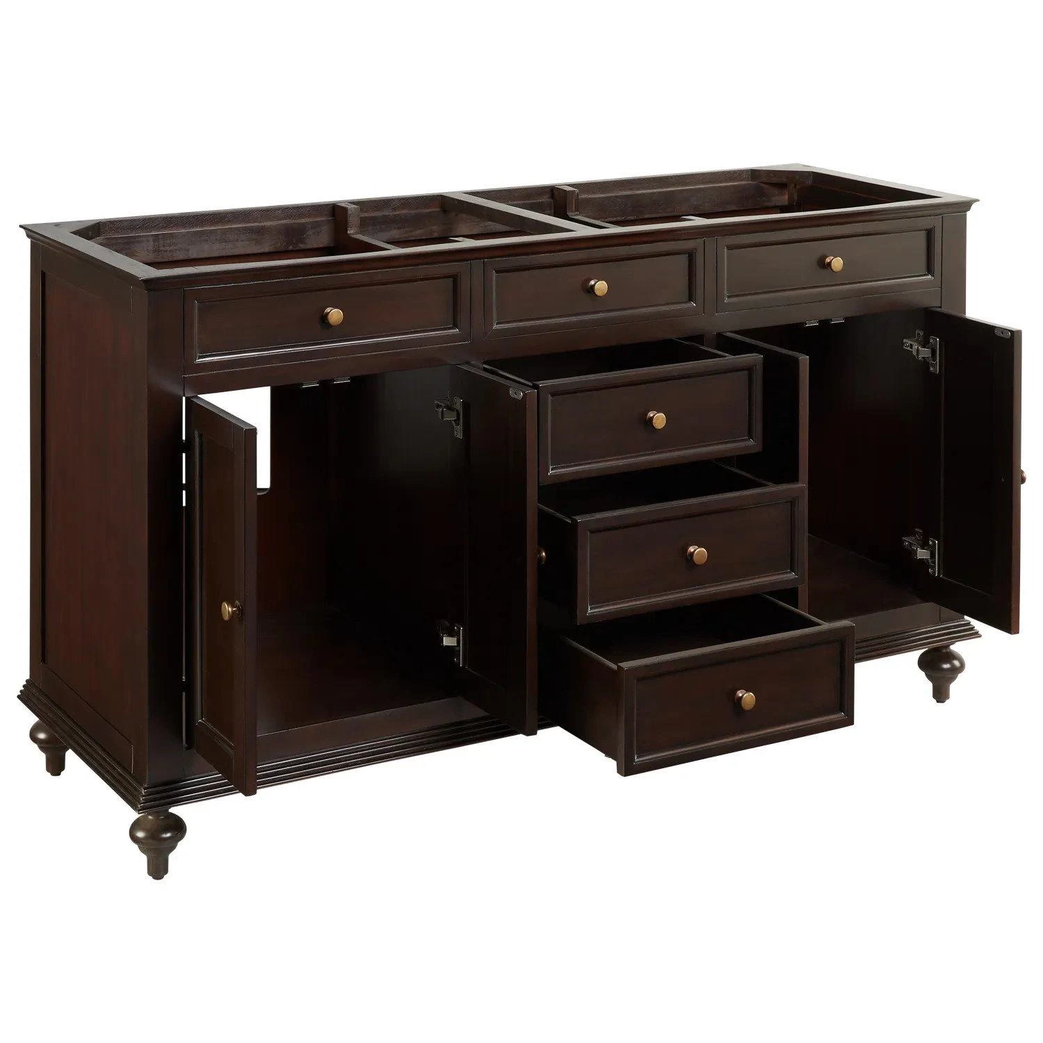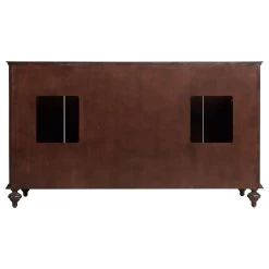 The 60″ Keller Mahogany Double Vanity has three stacked drawers and two large storage areas on each side. Decorative molding and antique brass hardware give this cabinet an elegant look. The dark espresso finish beautifully complements new or existing decor.