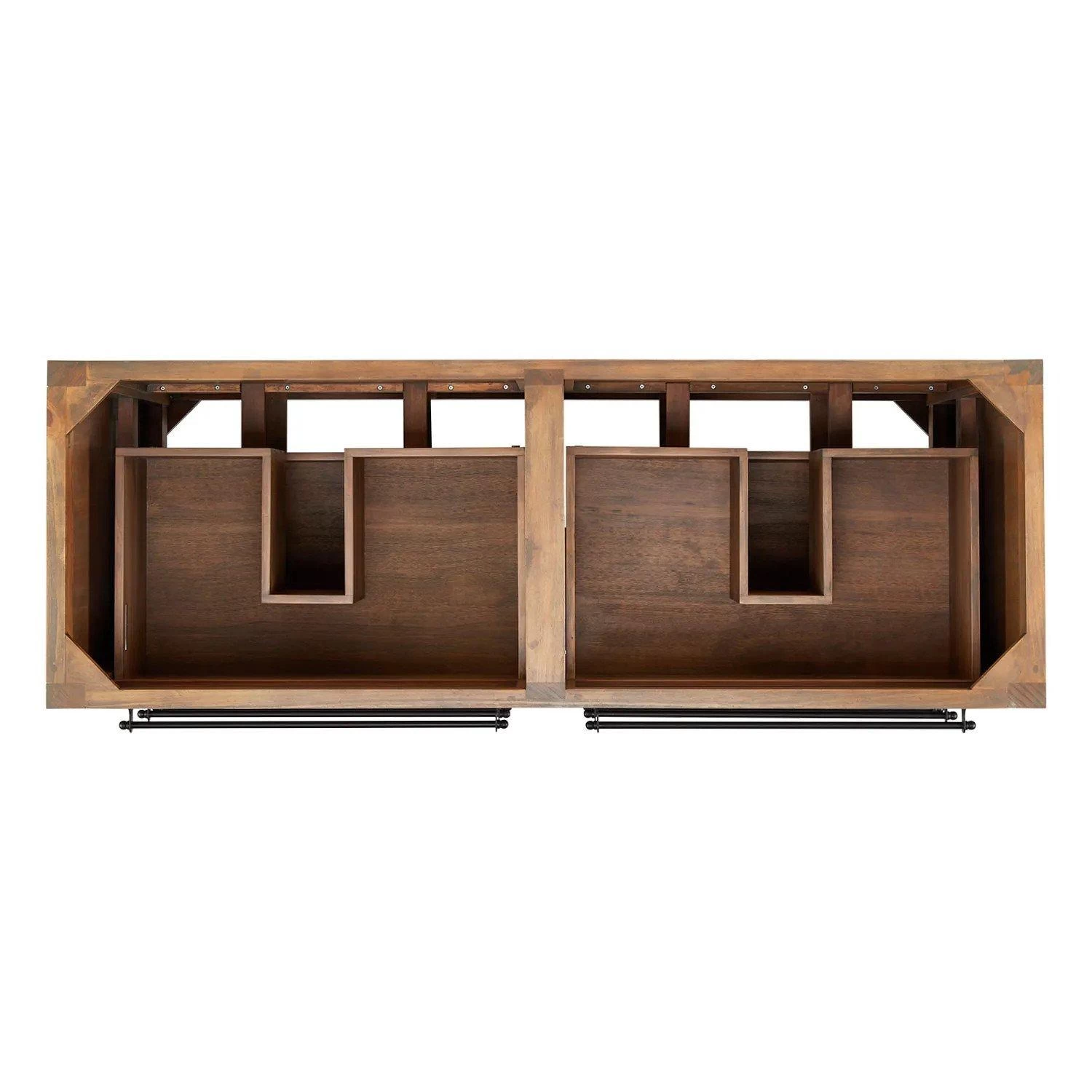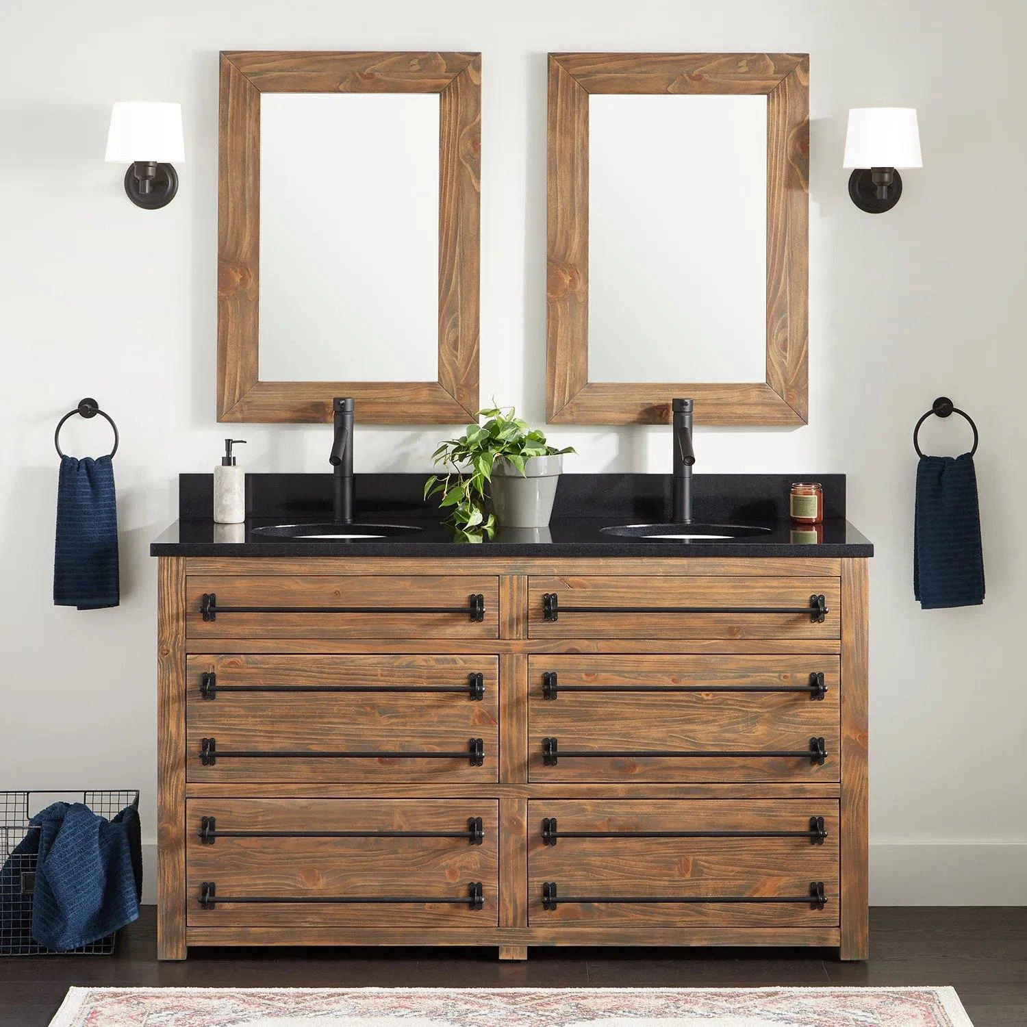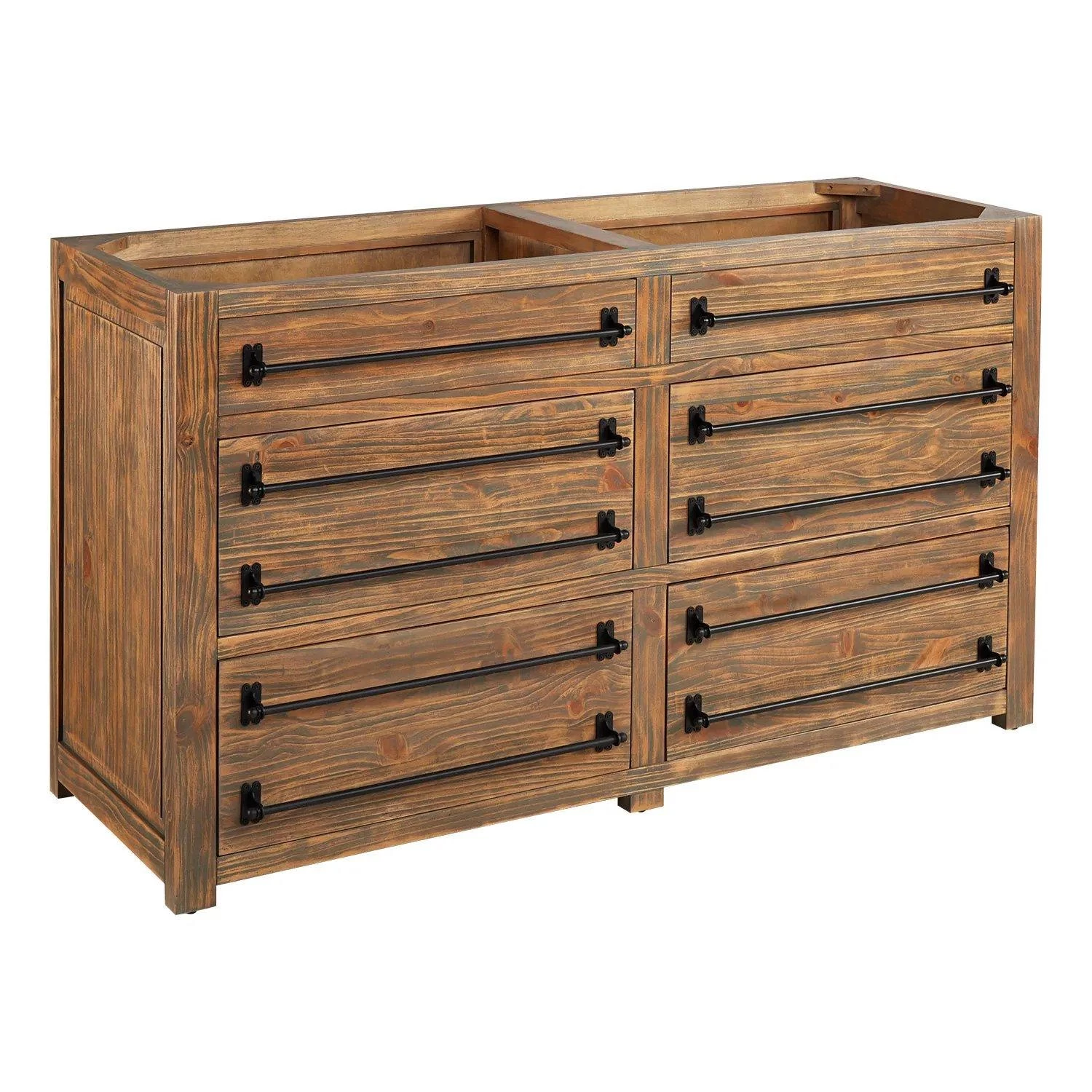 The 60″ Maysville Double Vanity for Undermount Sinks is a stylish storage solution for a rustic-themed master bath. Areas for toiletries are plentiful, with a total of four drawers available to keep your items organized. Soft-closing glides deliver smooth, silent closings and help protect the solid pine frame. A great fit for a chic remodel, this vanity features a gray wash finish and stylish black hardware that form its distressed look.