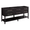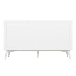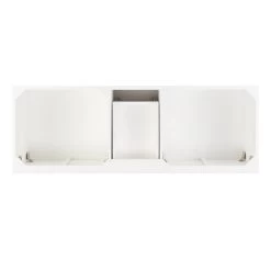 Refresh your shared space with the 60″ Novak Vanity in bright white. Its elegant look complements bathrooms of all styles, with sleek brass hardware and angled legs adding a touch of mid-century modern flair. Two sets of doors and five drawers reveal generous storage for tucking away both individual and shared items. To ensure seamless use with a luxurious feel, all entry points feature soft-closing hinges or slides. Designed for lasting beauty, the Novak is constructed of durable mahogany and, for a perfect fit anywhere, leveler feet are built in. To achieve a cohesive vanity setup, add the matching mirror above each sink area.
