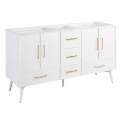 Refresh your shared space with the 60″ Novak Vanity in bright white. Its elegant look complements bathrooms of all styles, with sleek brass hardware and angled legs adding a touch of mid-century modern flair. Two sets of doors and five drawers reveal generous storage for tucking away both individual and shared items. To ensure seamless use with a luxurious feel, all entry points feature soft-closing hinges or slides. Designed for lasting beauty, the Novak is constructed of durable mahogany and, for a perfect fit anywhere, leveler feet are built in. To achieve a cohesive vanity setup, add the matching mirror above each sink area.