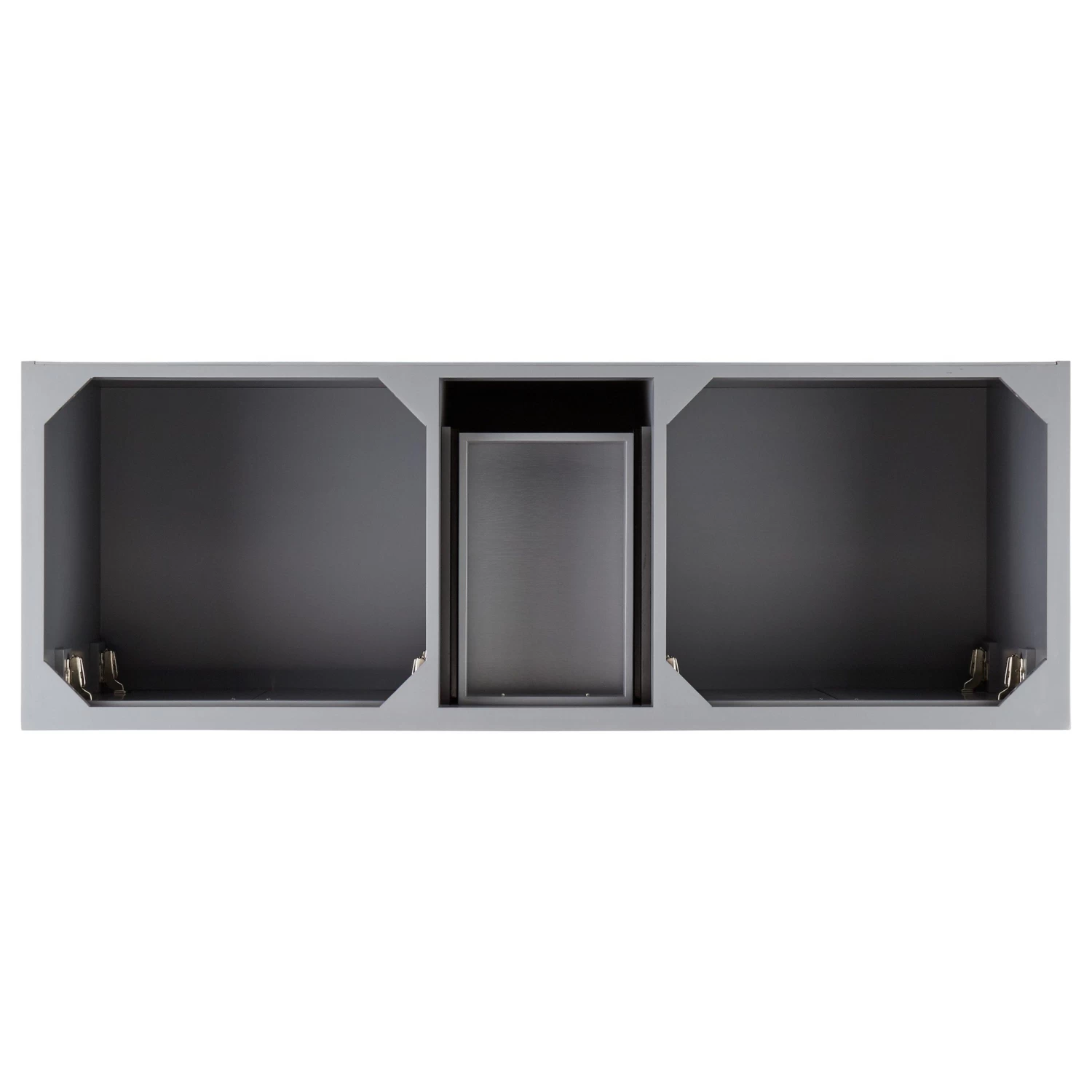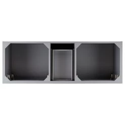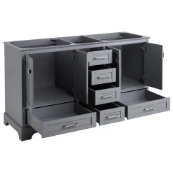 The 60″ Quen Double Vanity brings a timeless look to your owner’s bathroom with its beautiful gray finish. Accented with brushed nickel hardware, this statement piece shines in spaces of all styles. Each sink area houses double doors for storing larger accessories, and below that, a drawer spans the length of both doors. Stacked drawers line the middle of the Quen to provide easy access to shared toiletries. For smooth everyday use, every entry point is equipped with soft-close hinges or slides. Add on a matching vanity mirror for an elegant, cohesive look.