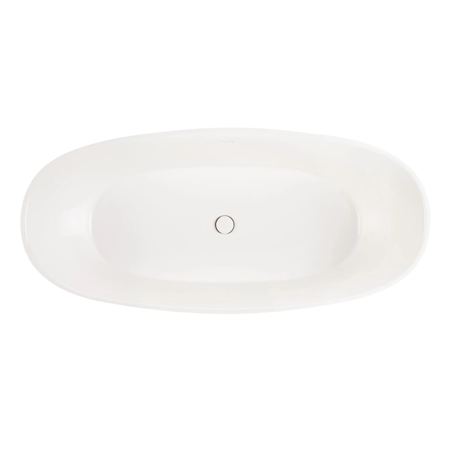 Elegant yet minimal, the Giosa Solid Surface Freestanding Tub has a flared oval shape that coordinates with any bathroom design. Its oval shape creates a comfortable interior, featuring sloped ends for supported lounging in either direction. A centrally located, toe-tap drain is easy to operate and matches the body’s gloss white finish. With an integral drain and overflow system building into its walls, this tub requires no exposed piping for a clean look.