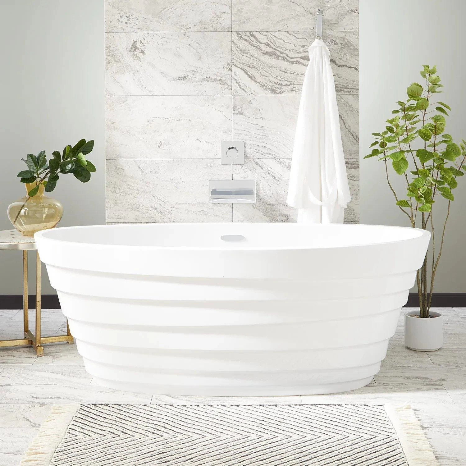 The Prescot Freestanding Acrylic Tub boasts a stepped exterior design that adds a bold element to your space. Its large oval shape provides ample room to relax during long soaks. Featuring an integral drain and overflow system, this tub requires no exposed piping for a clean, contemporary look.