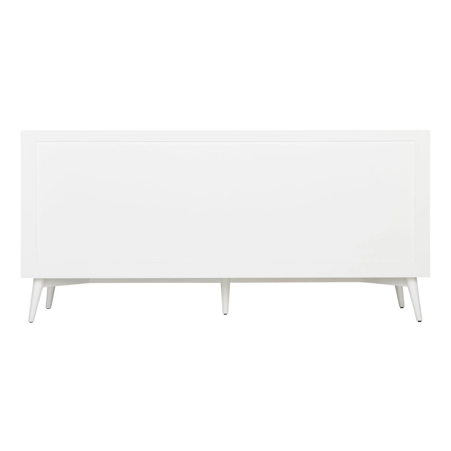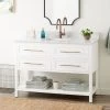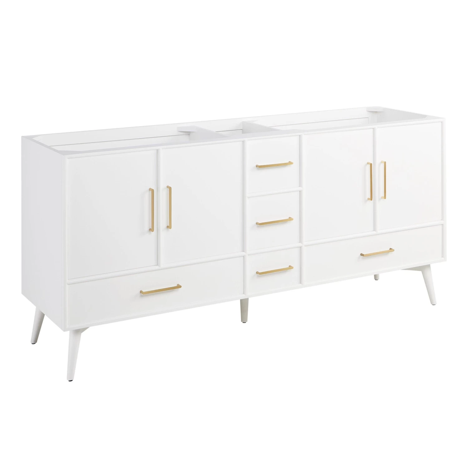 Bring mid-century modern flair to your shared space with the 72″ Novak Vanity with Undermount Sinks. Constructed of mahogany, this durable build features sleek brass hardware and tapered legs, giving it a clean and simple silhouette. A bright white finish adds an elegant look that complements spaces of all styles. Each sink area features its own main compartment and a drawer below, with three additional drawers lining the middle, creating endless options for organizing both shared and individual items. To ensure a seamless fit in any space, leveler feet are built into the Novak’s design. Add the matching vanity mirror above each sink area for a cohesive look.