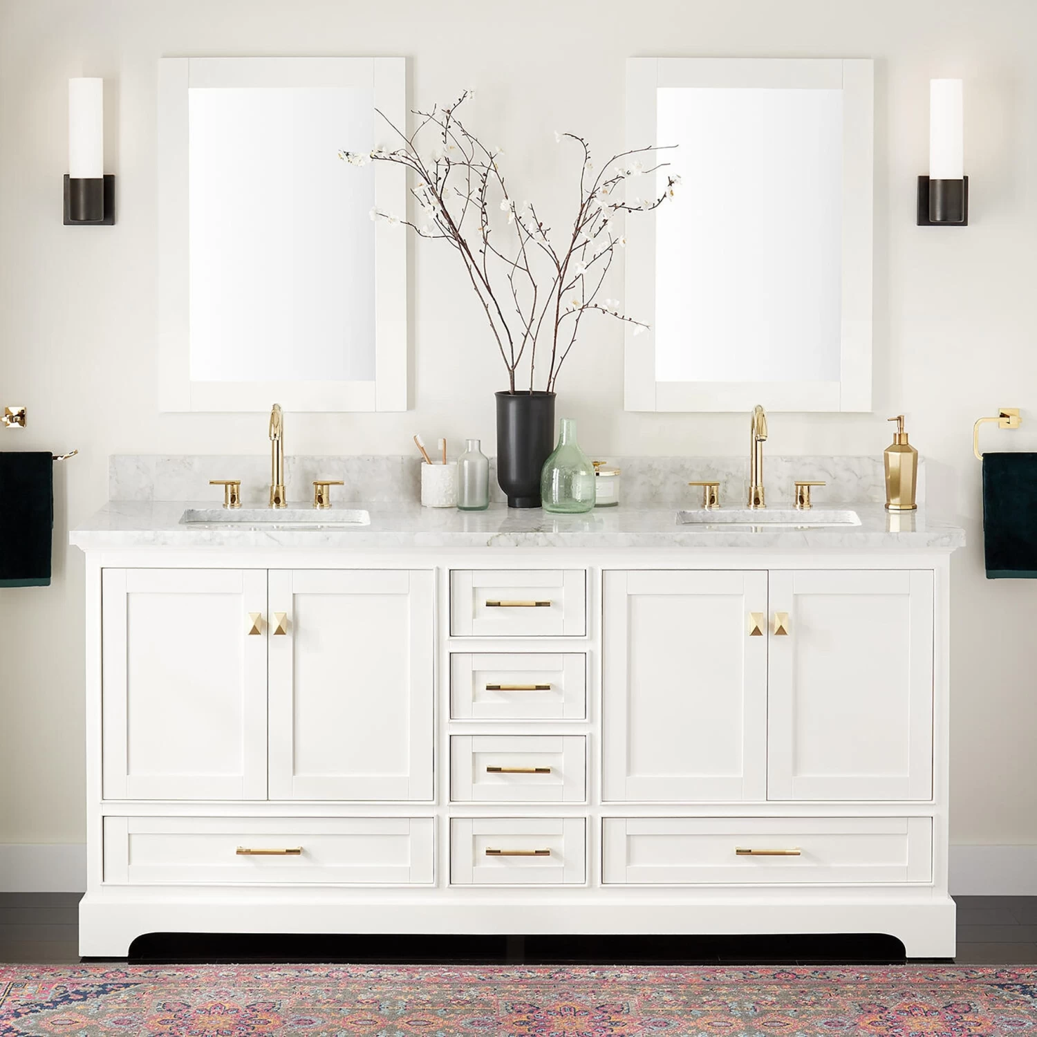 The 72″ Quen Double Vanity is beautifully constructed and built to last. Made of quality wood, this centerpiece features a total of six drawers and two spacious compartments that allow for both private and shared storage opportunities. Every entry point is soft-closing to prevent slamming and to ensure smooth operation. Its transitional design features a soft white finish accented with satin brass hardware, making the Quen a refreshing addition to any spacious bathroom. For the full effect, add on the matching vanity mirror above each sink.