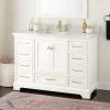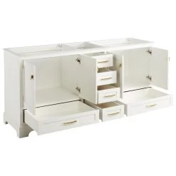 Refresh your shared bathroom with the 72″ Quen Double Vanity. Boasting a total of six drawers and two large compartments, this impressive centerpiece is a great option for those looking to solve their storage woes. Soft-close hinges and slides are equipped at all entry points to ensure that the wood frame remains protected day after day. The soft white finish serves as the perfect backdrop for satin brass hardware, making the Quen an ideal option for remodels of all styles. Add matching vanity mirrors above each sink to achieve the complete look.