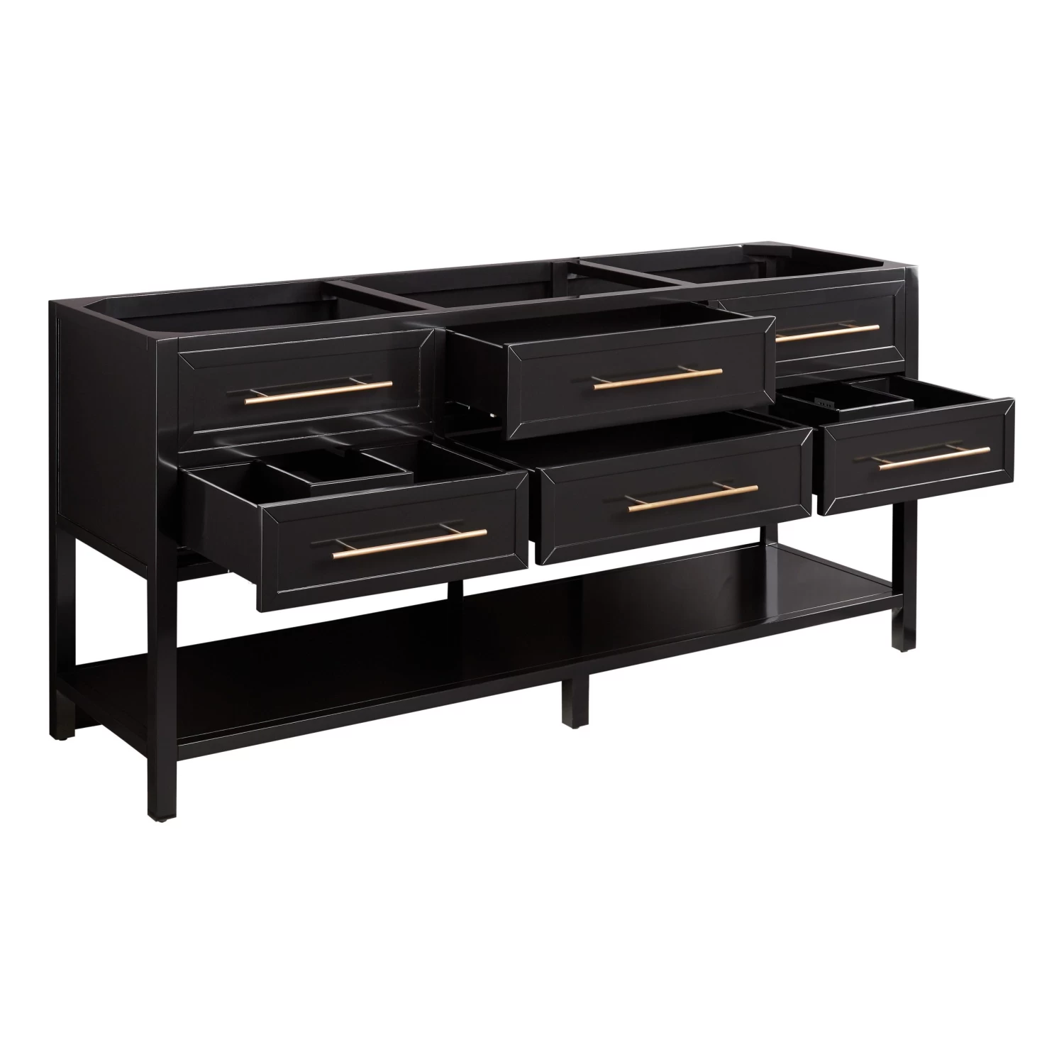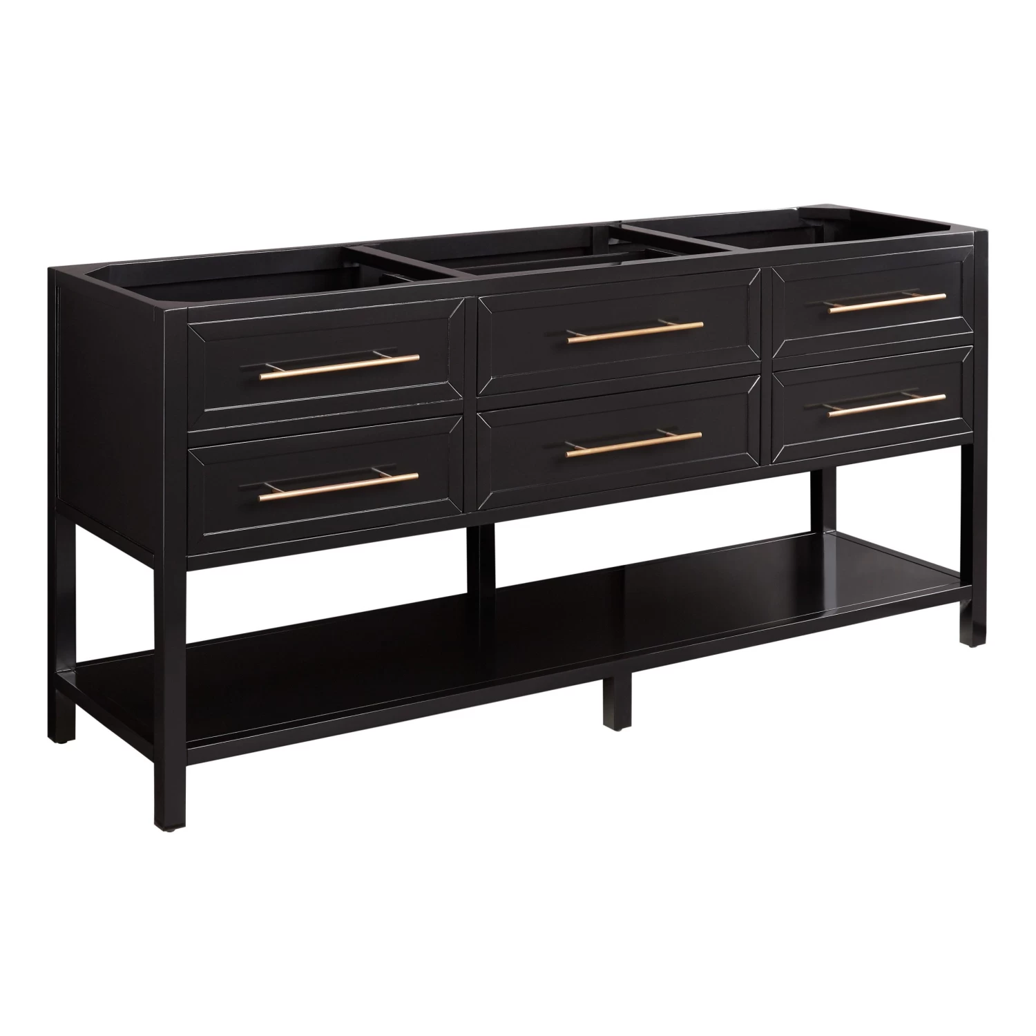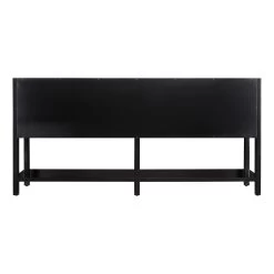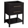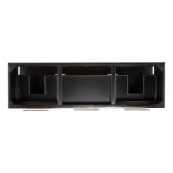 A substantially sized bathroom benefits from a standout piece like the 72″ Robertson Double Console Vanity in black. Sleek and sophisticated, it exudes modernity yet offers an enduring design. The mahogany double-sink vanity features glossy black hardware and has four soft-closing drawers to ensure plenty of space for your essentials. There?s even an open storage shelf at the base for extra items.