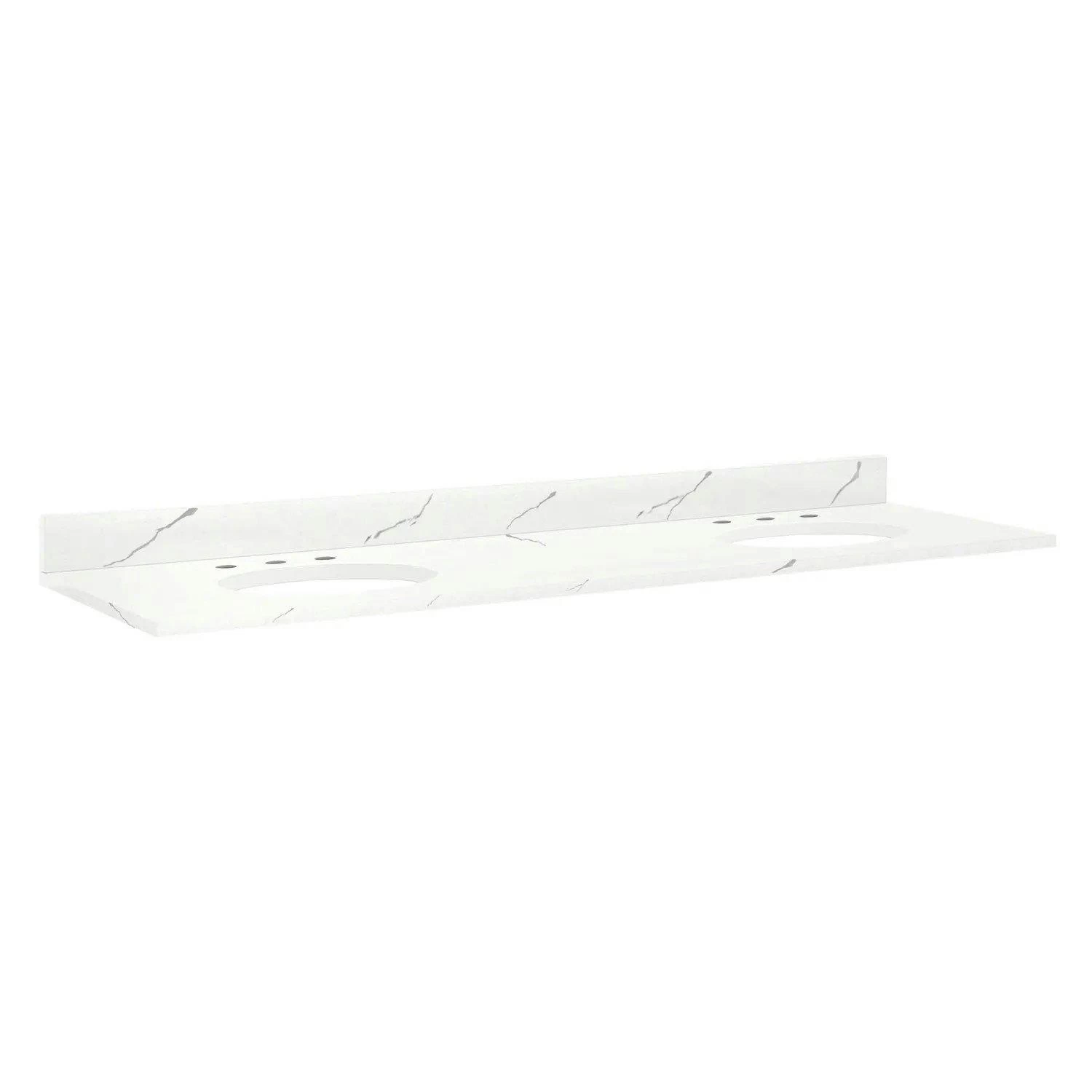 The streaking gray veins pop on the bright white background of this 73″ Hailstone White Quartz Vanity Top. Emulating the look of marble, it features a glossy sheen that resists stains and is simple to clean and maintain. At 3cm thick, it has the durability to handle everyday demands. To make installation seamless, it comes pre-drilled for two 8″ widespread faucets and a pair of oval undermount sinks.