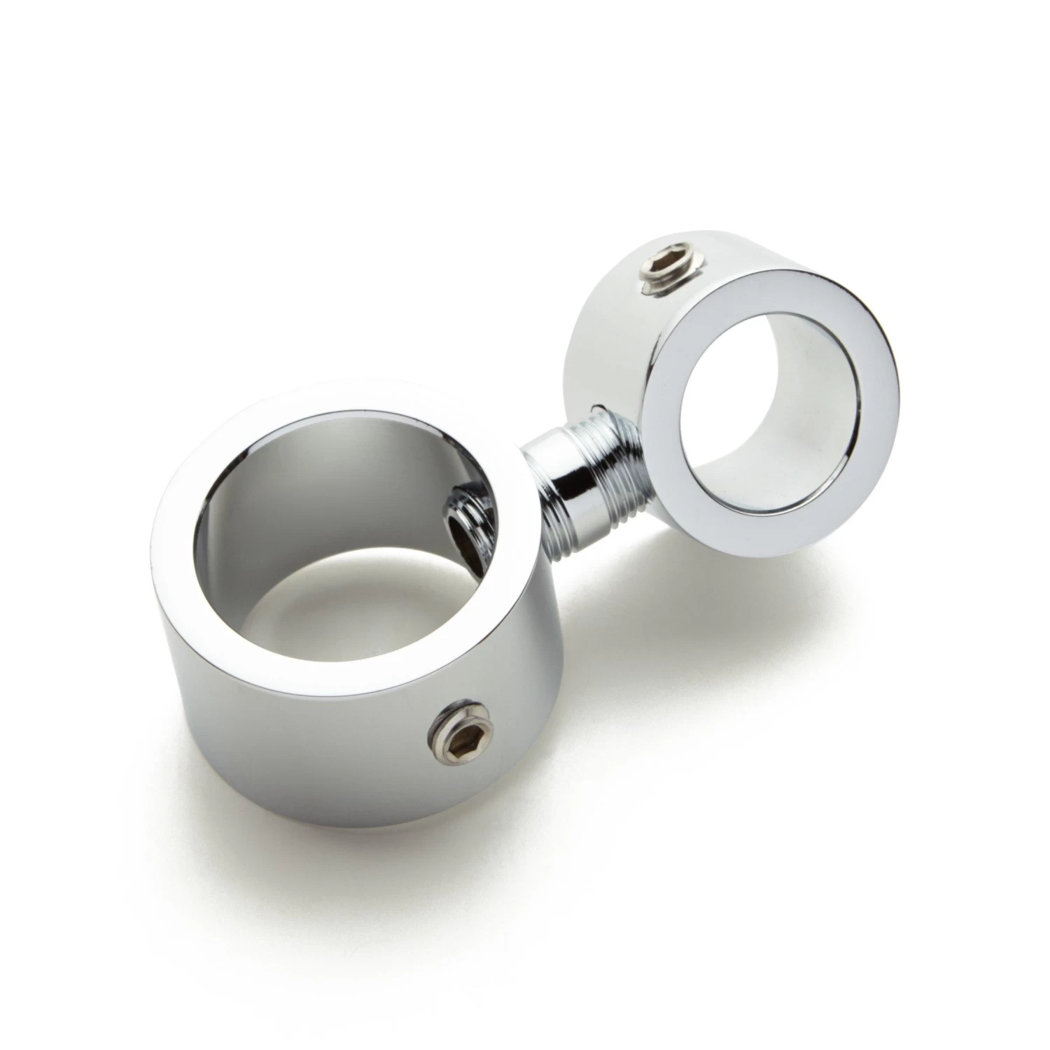 This adjustable double ringlet riser holder connects shower risers to shower rods and holds them steady.
