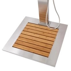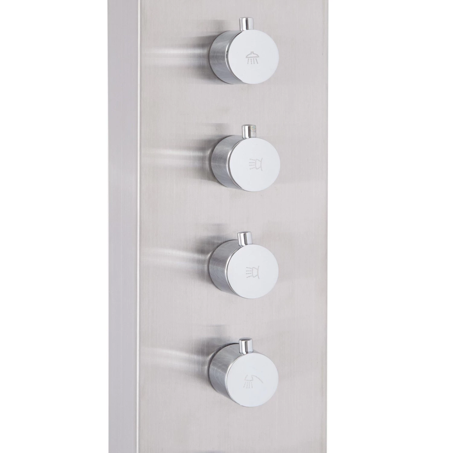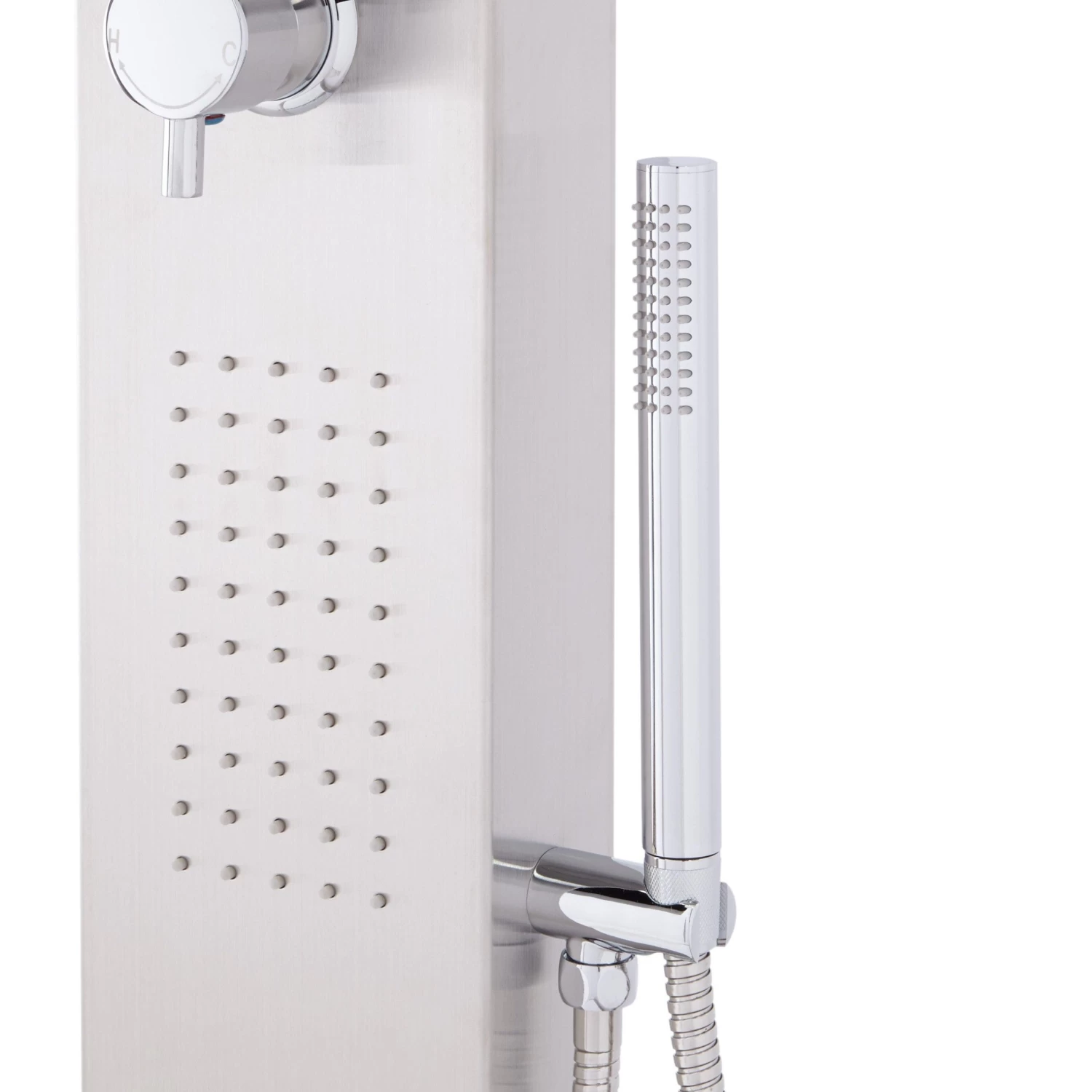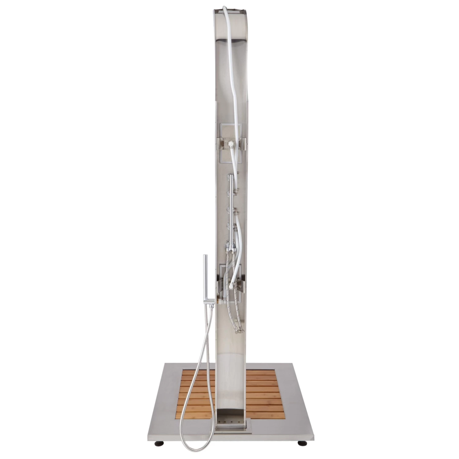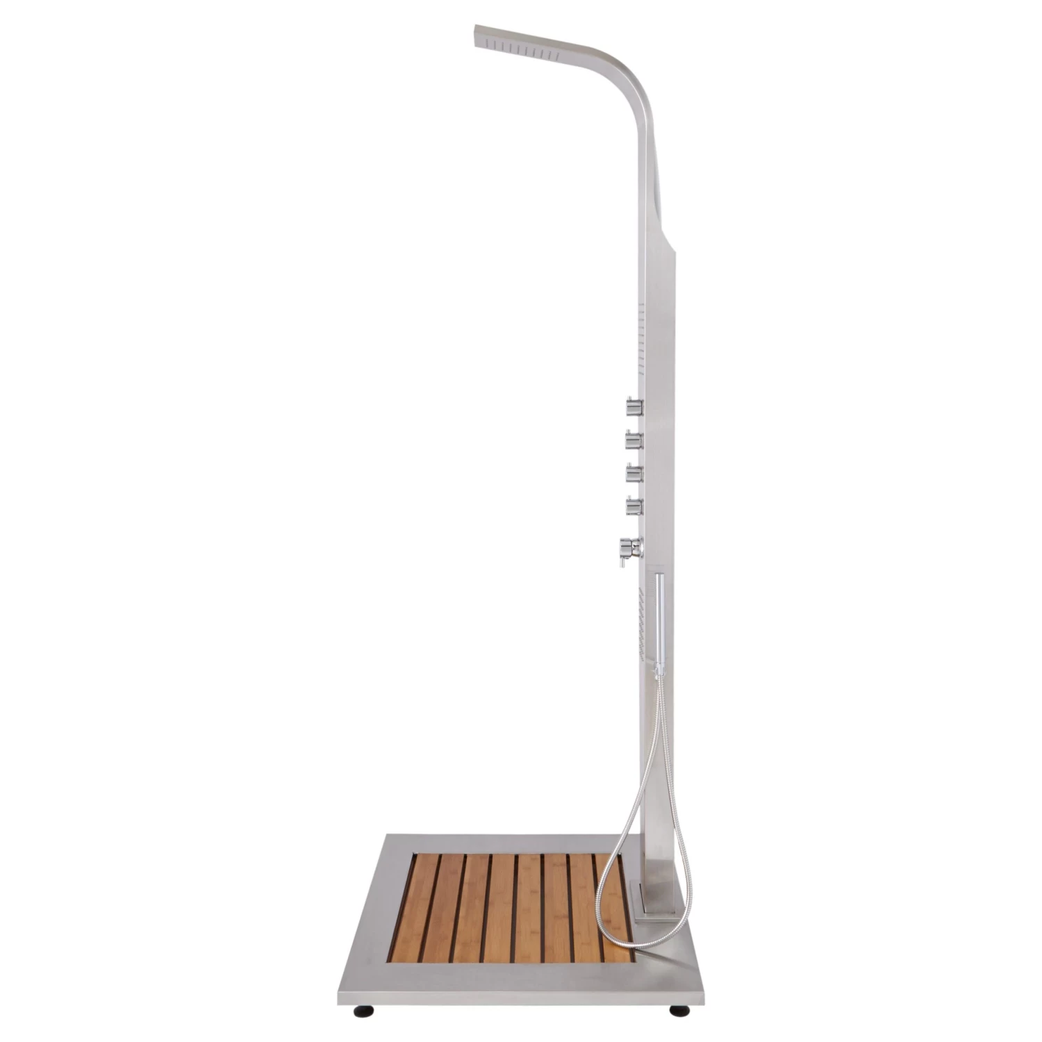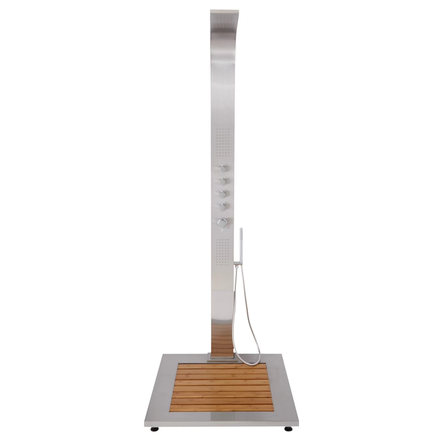 The Alvin Outdoor Stainless Steel Shower Panel features a beautiful design and modern amenities. This product has an integrated shower head, bamboo tray, and a hand shower that is perfect to rinse off with after playing in the yard or taking a dip in the pool.