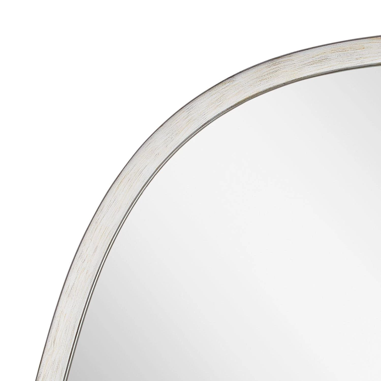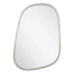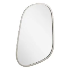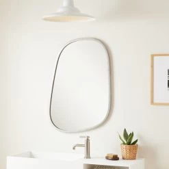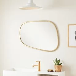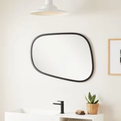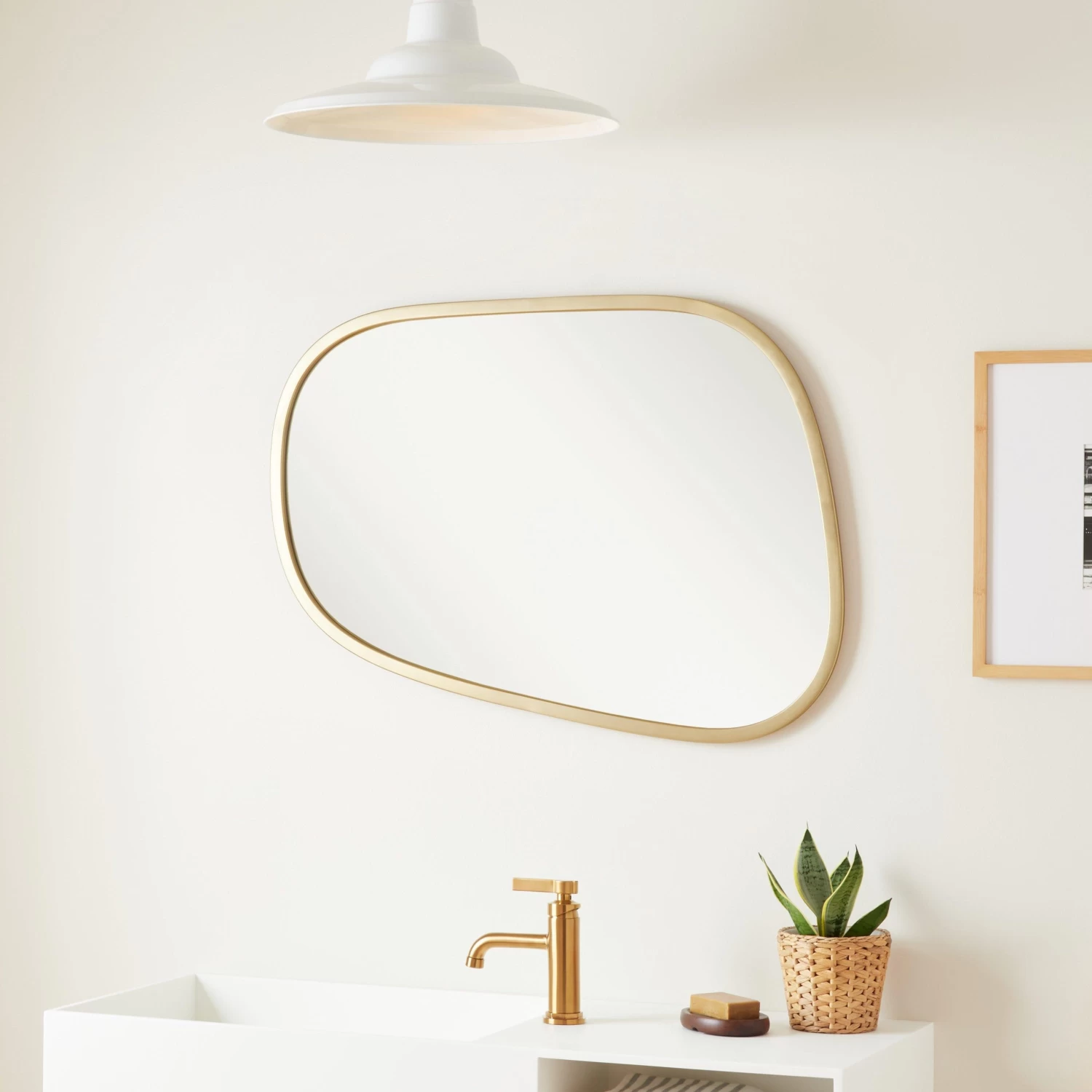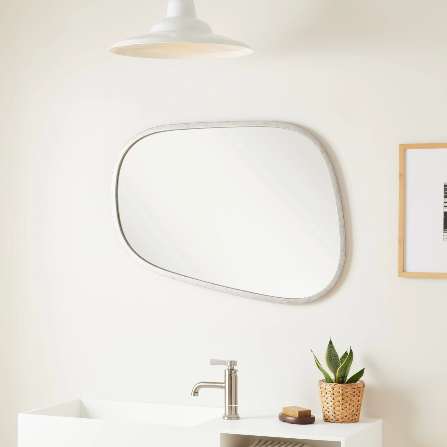 Complete an organic modern look with the Amburgey Asymmetrical Decorative Vanity Mirror. Featured in an irregular rectangle shape with a thin iron frame, this accent perfectly blends minimalist design with bohemian flair. Choose your favorite finish to complete the look.