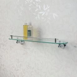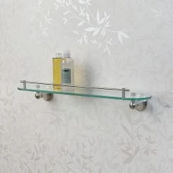 Add a stylish accent to your bath or powder room with the Ballard Collection Tempered Glass Shelf. Supported by contemporary backplates, this shelf will pair seamlessly with other accessories in the Ballard Collection.