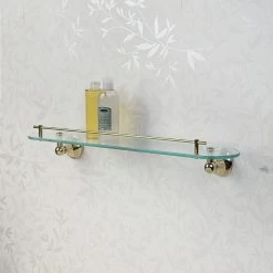 Add a stylish accent to your bath or powder room with the Ballard Collection Tempered Glass Shelf. Supported by contemporary backplates, this shelf will pair seamlessly with other accessories in the Ballard Collection.