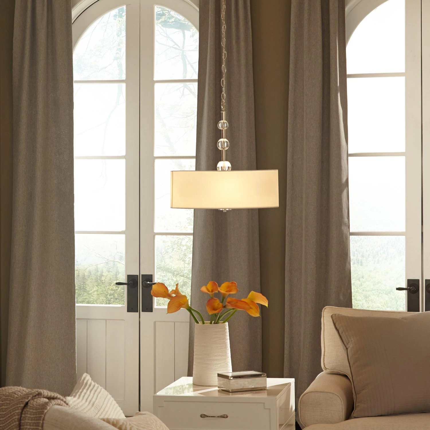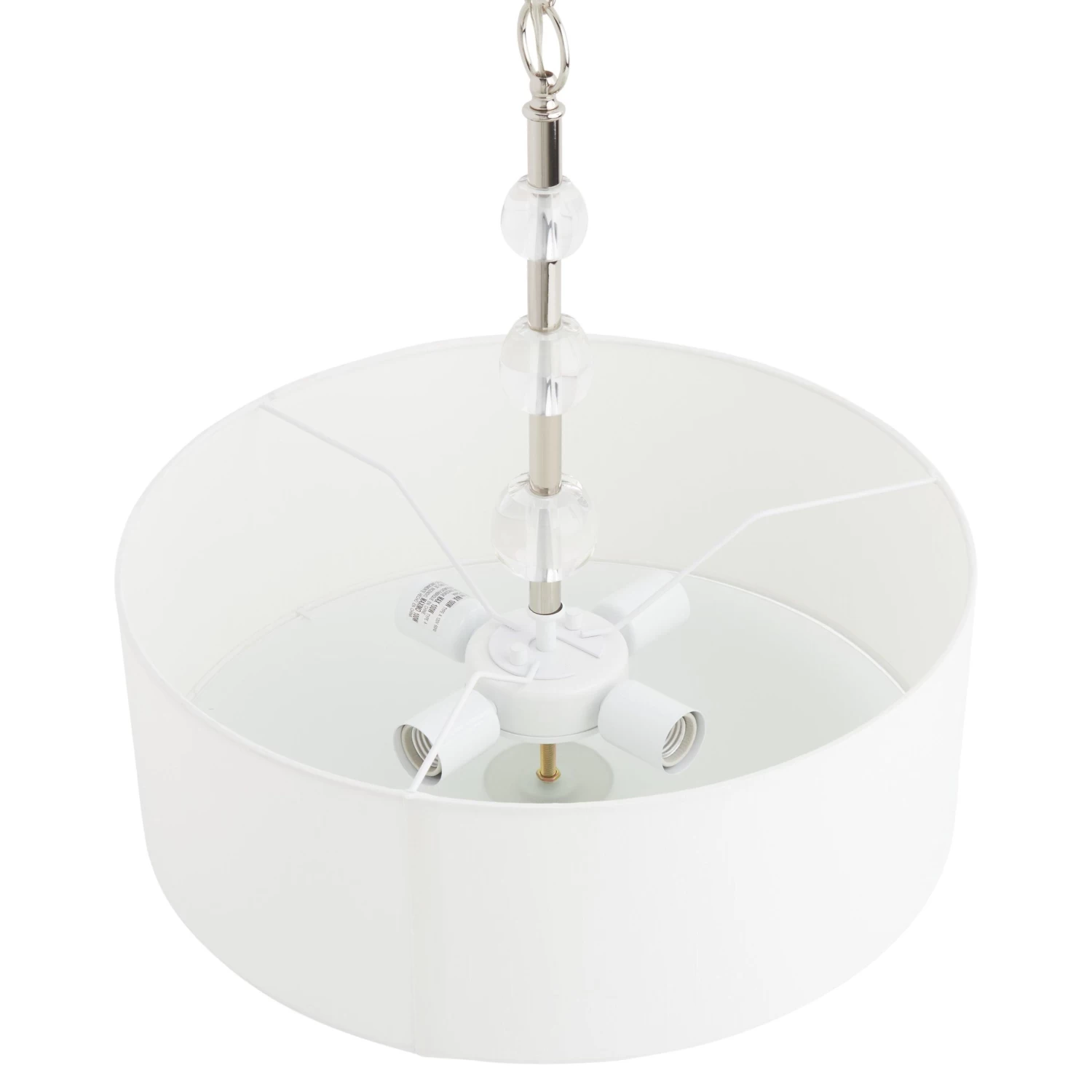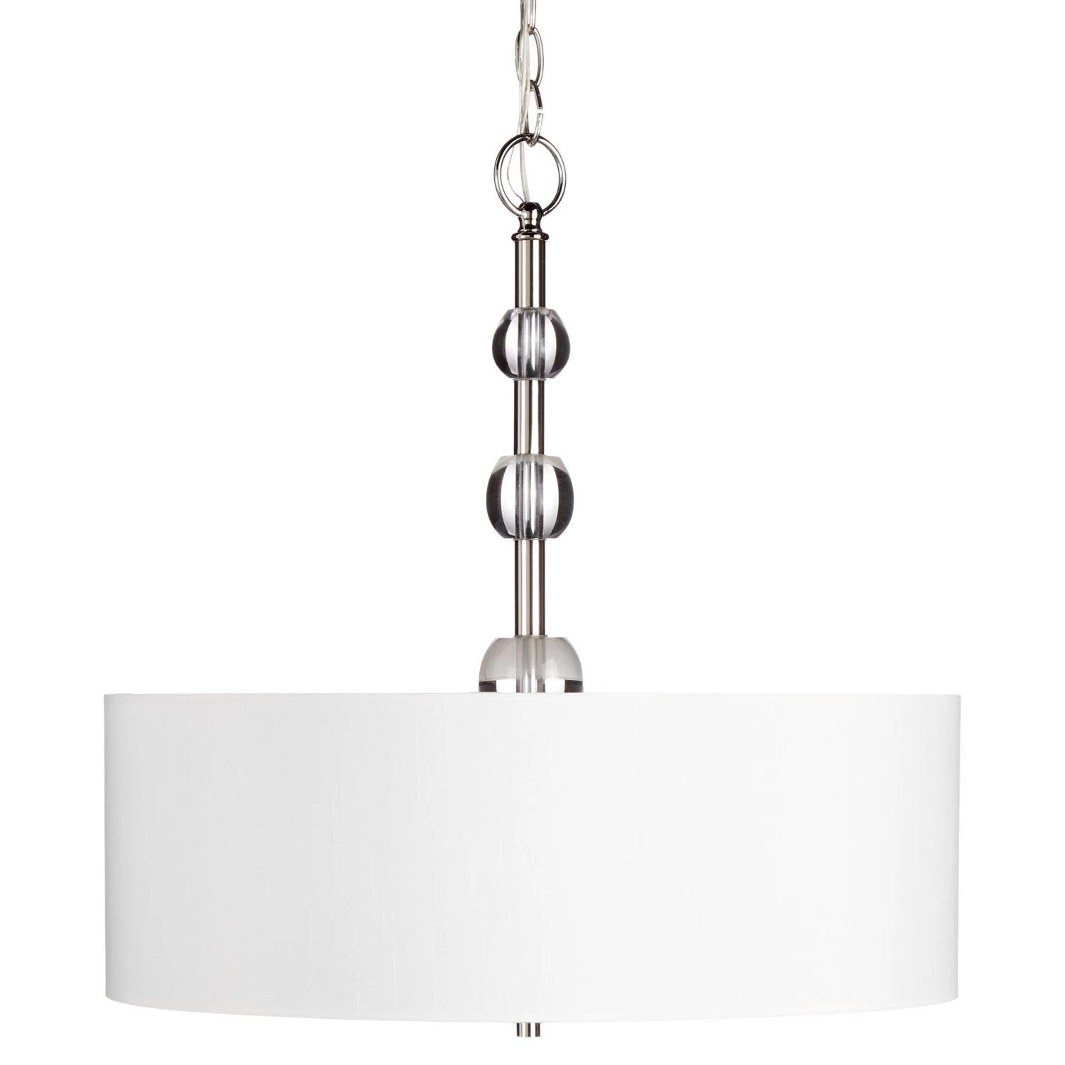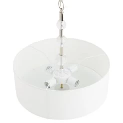 A modern design makes the Bankloft Chandelier ideal for a chic home. This product features four lights that shine brightly within the drum-style shade, which is made of white fabric. A frosted-glass base helps produce a soft yet effective glow to create a well-lit space. Hanging by chain link and a rod embellished with globed accents, the Bankloft will look beautiful suspended from a high-vaulted ceiling. Comes with all mounting hardware needed for installation.