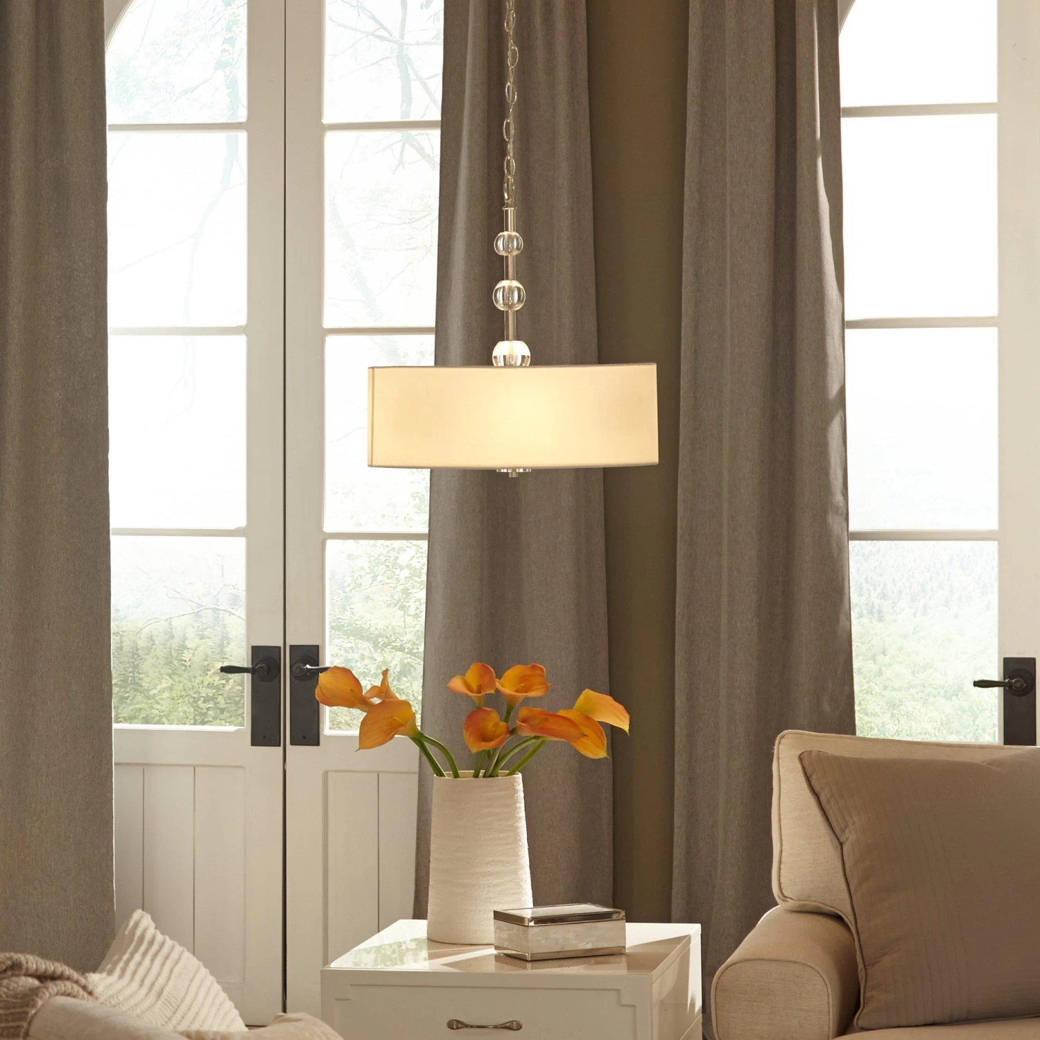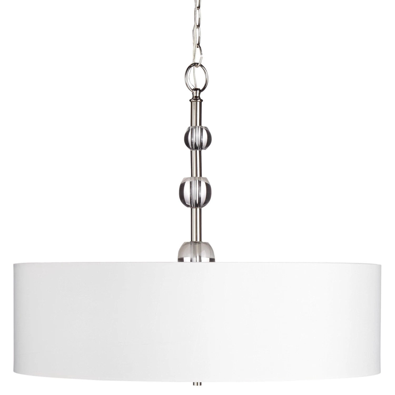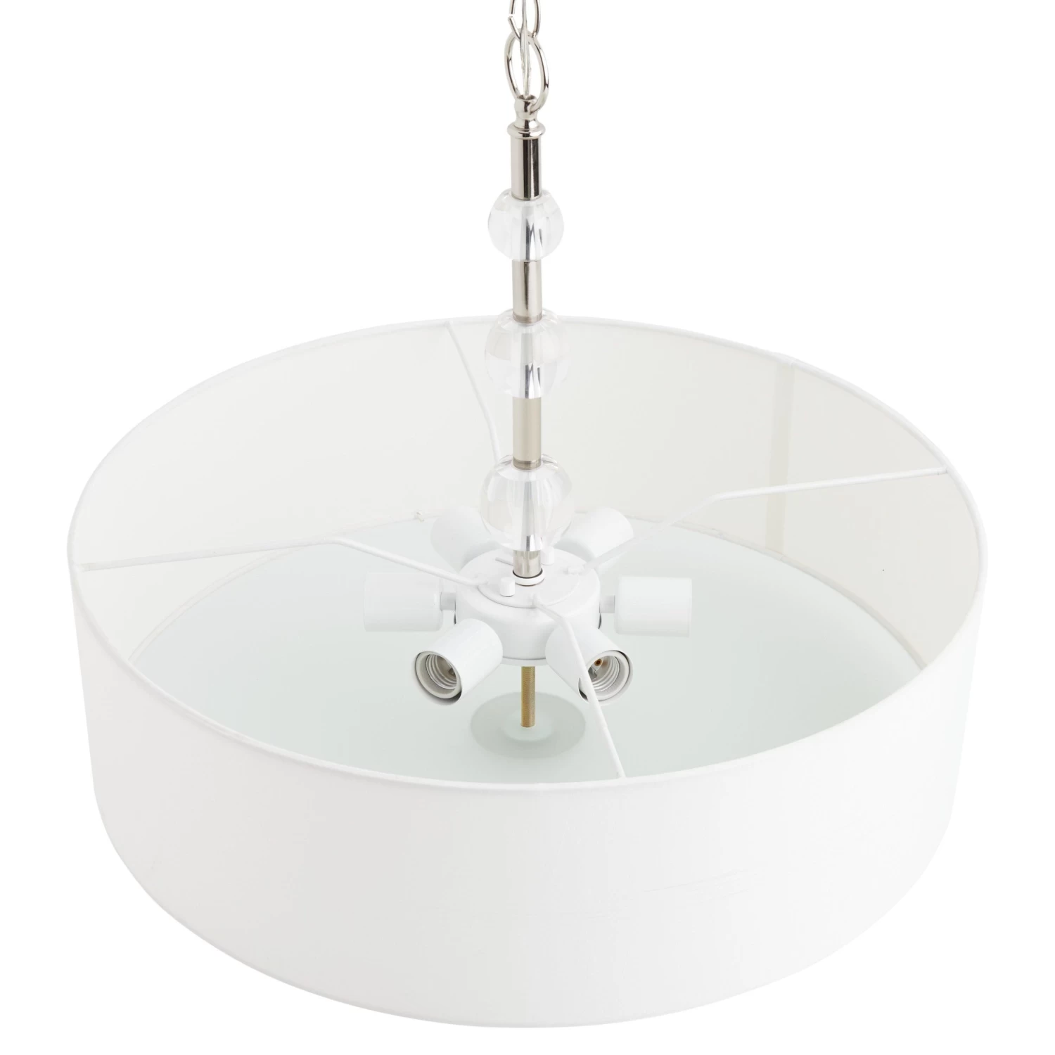 The Bankloft Chandelier will look right at home in a modern space. This product features six lights that shine brightly within the drum-style shade, which is made of white fabric. A frosted-glass base helps produce a soft yet effective glow to create a well-lit space. Hanging by chain link and a rod embellished with globed accents, the Bankloft will look beautiful suspended from a high-vaulted ceiling. Comes with all mounting hardware needed for installation.