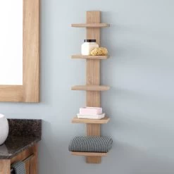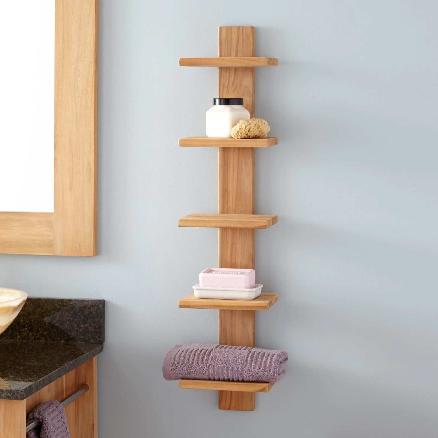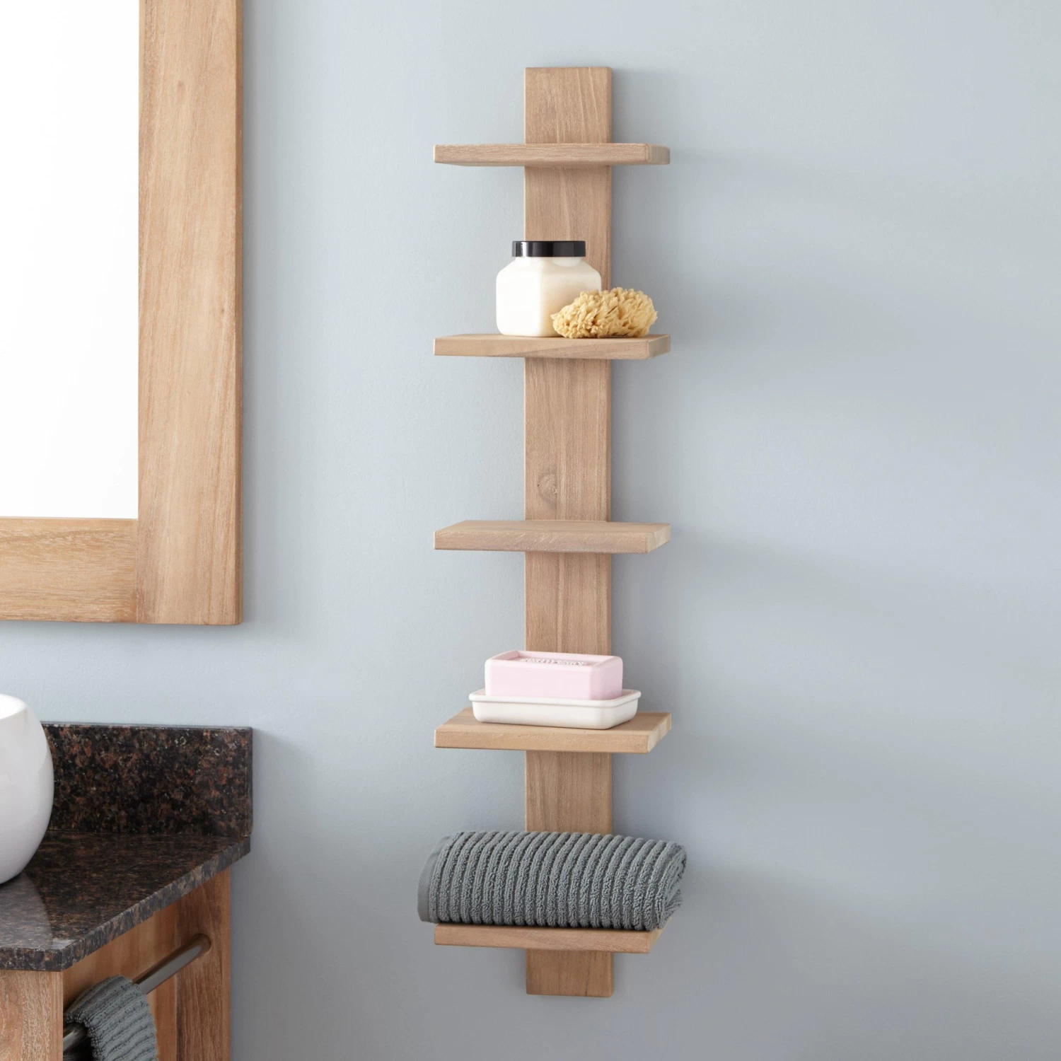 The Bastian Hanging Bathroom Teak Shelf features a stacked design that holds your items while taking up minimal space. This product is made of teak, a durable wood that is perfect for the damp, temperature-varied conditions that often occur in the bathroom.