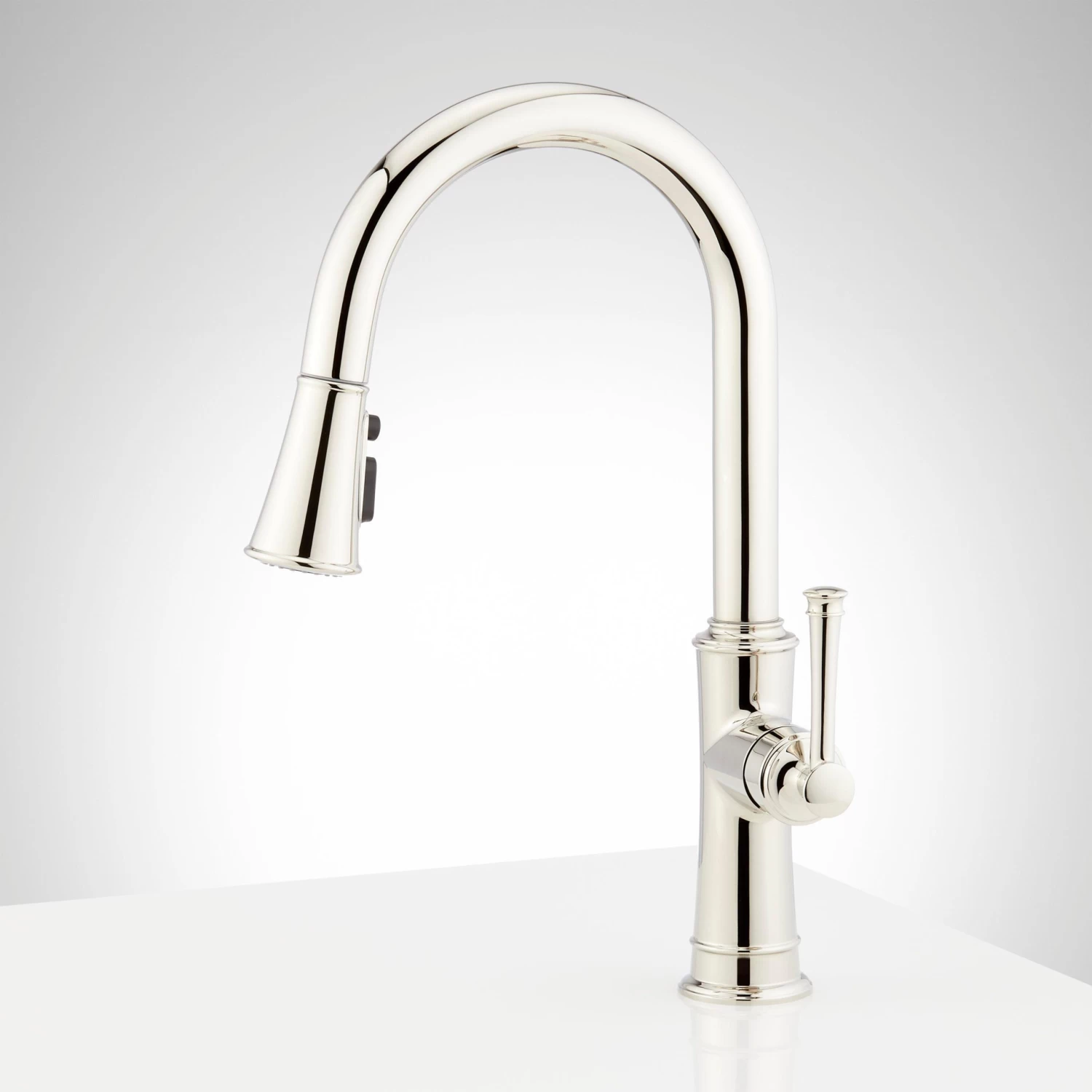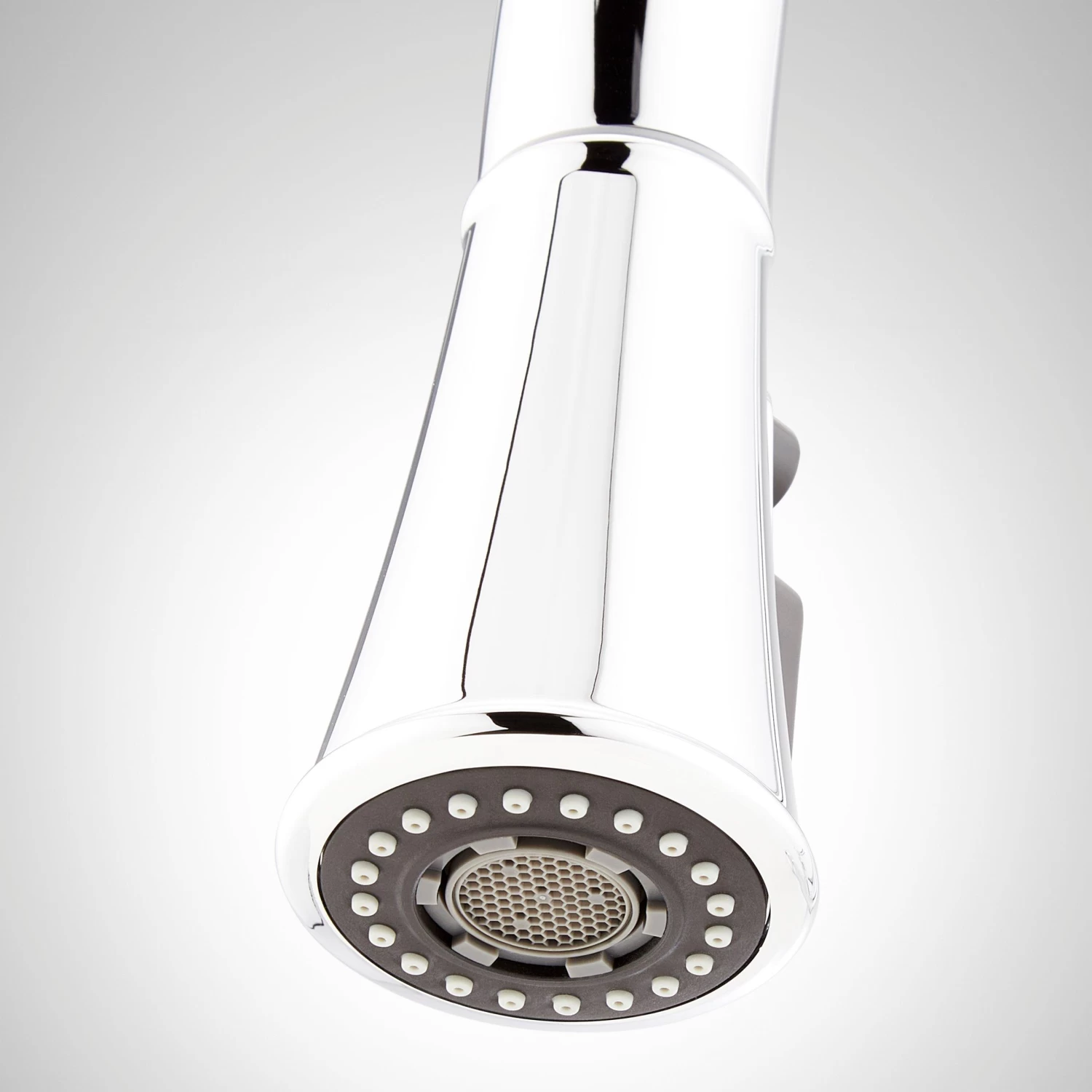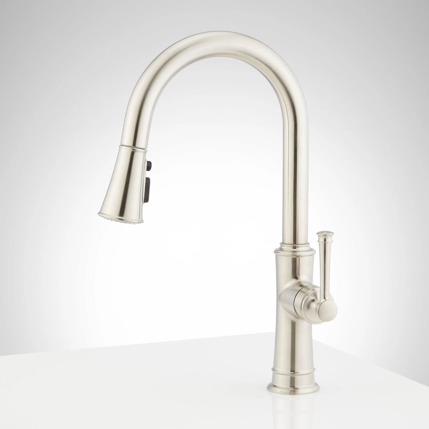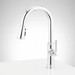 The Beasley Single-Hole Kitchen Faucet has a button that lets you quickly switch from aerated stream to a powerful spray. A premium finish covers this product to deliver lasting rust-resistant beauty. A great fit for a busy kitchen, the Beasley’s faucet head can be pulled down from its swivel spout for increased mobility when rinsing dishes.
