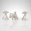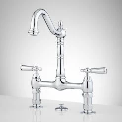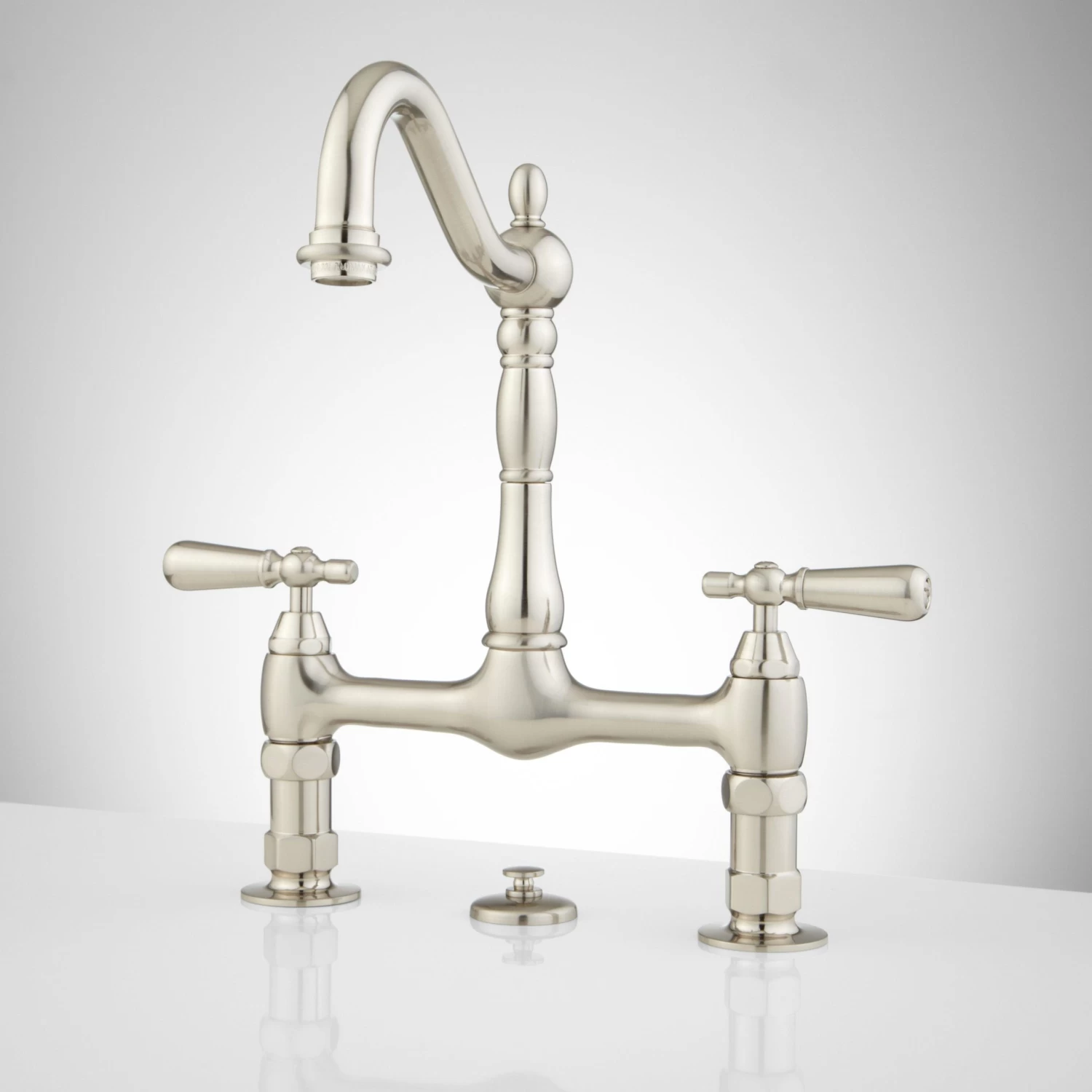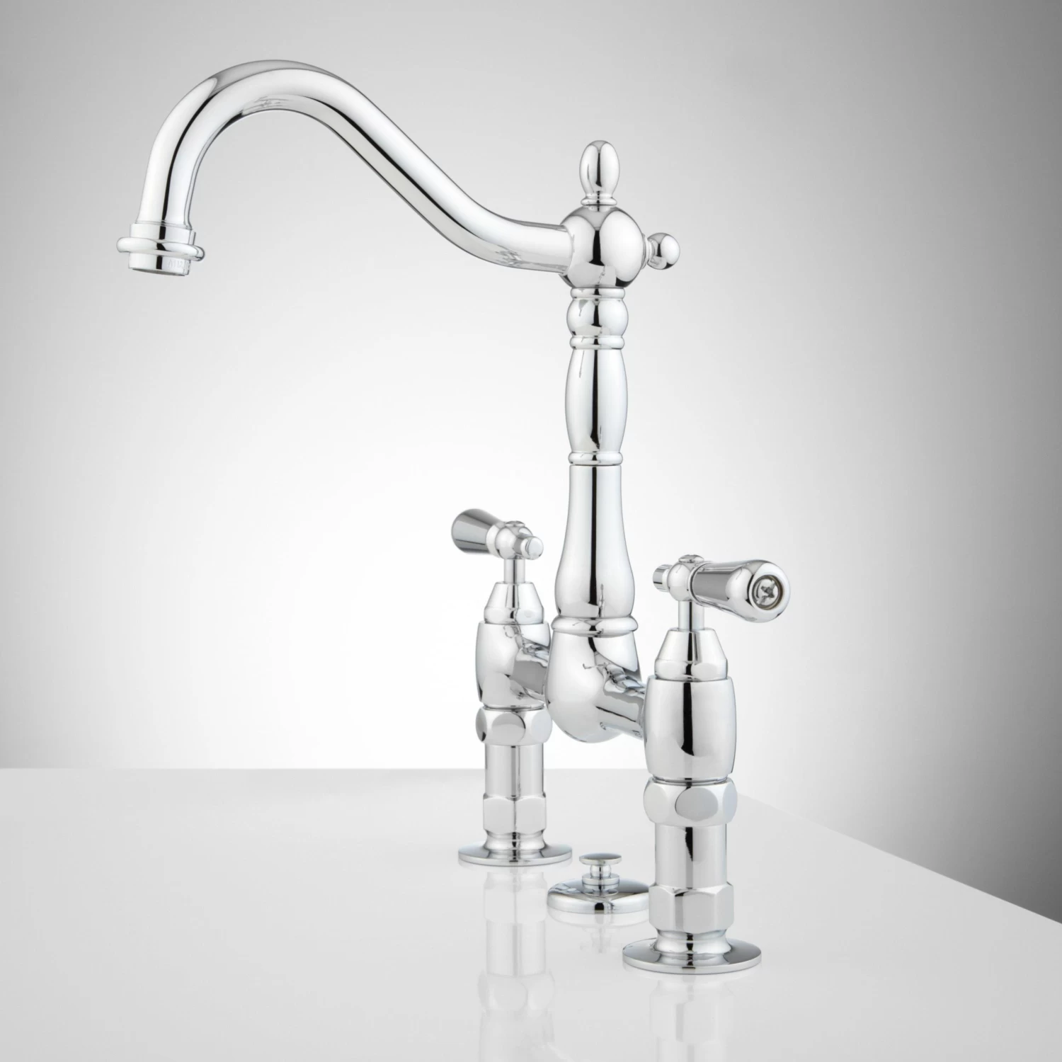 This antique style lavatory faucet features a hooked spout, smooth bridge style body and metal lever handles.