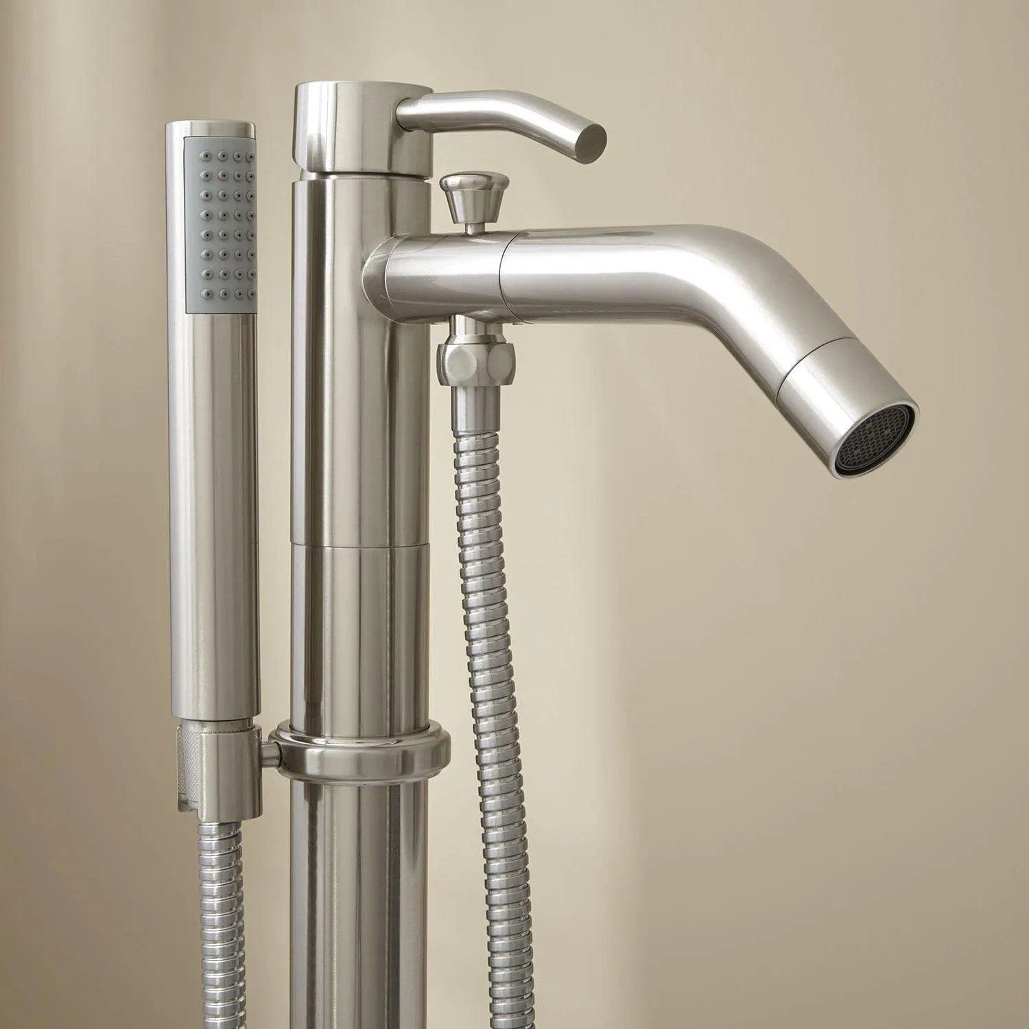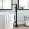 The Caol Freestanding Faucet fittingly complements a sleek contemporary tub with the added benefit of a hand shower. This tub filler’s minimalist design is accented by an angled lever and spout. The faucet’s tubular hand shower is connected with a long, flexible hose that allows for convenient rinsing.